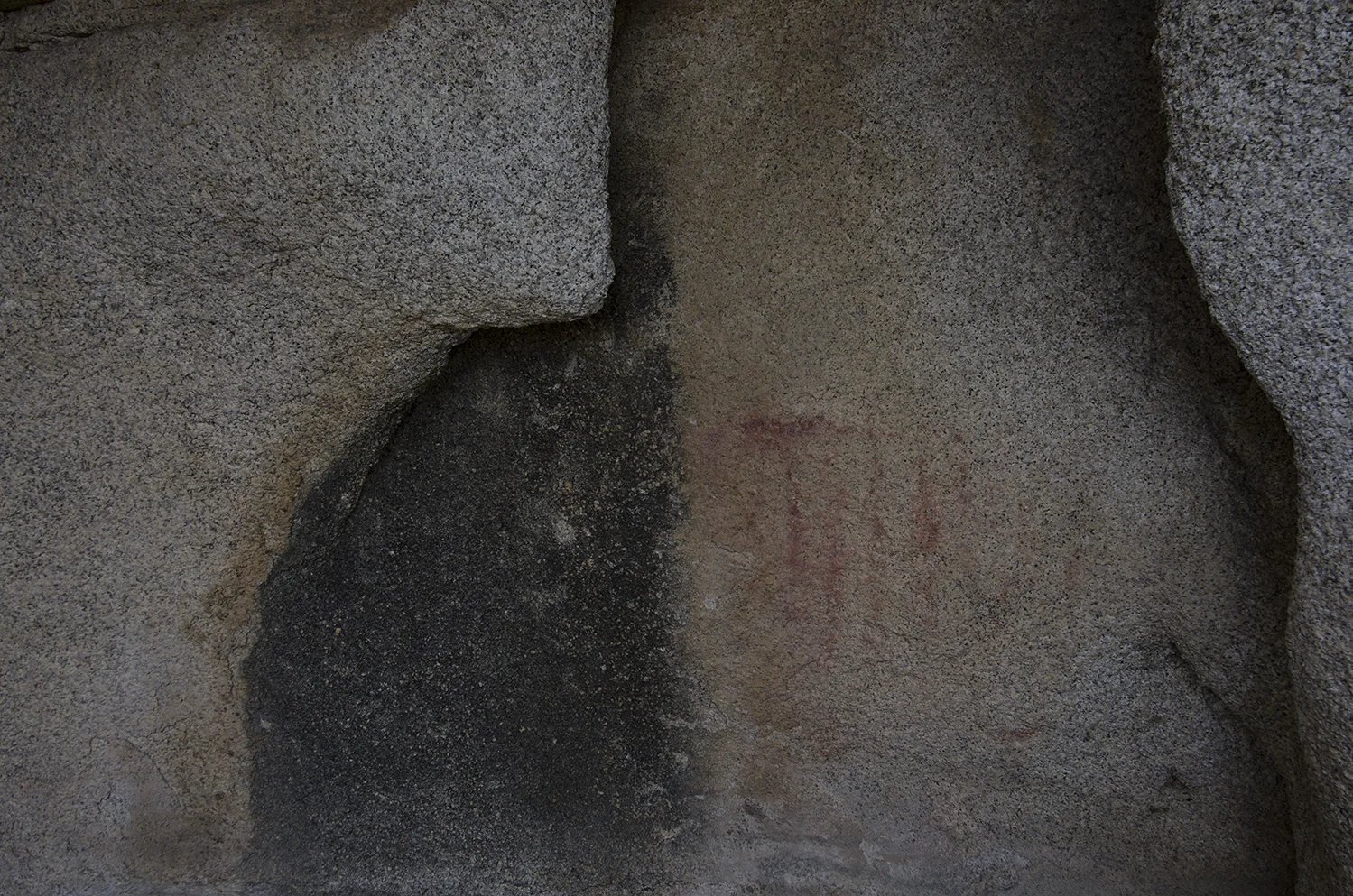 If you’re paying attention as you hike towards the main north/south wash that leads into the Wonderland, you might run across a very interesting spot. A group of small caves show evidence of having been used by man in prehistoric times as well as in recent history. A fading pictograph is on one rock wall, and out in front of the openings is a bedrock mortar. Portions of the openings have been closed with rocks and cement, evidence that they may have been used for storage during the days of the Wonderland Ranch.