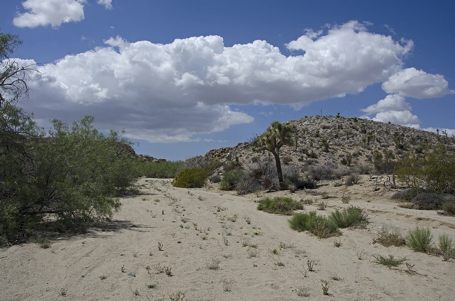 Here's the beginning of the route I took. Lots of stuff growing in the wash, lots of sand. I heard bees.