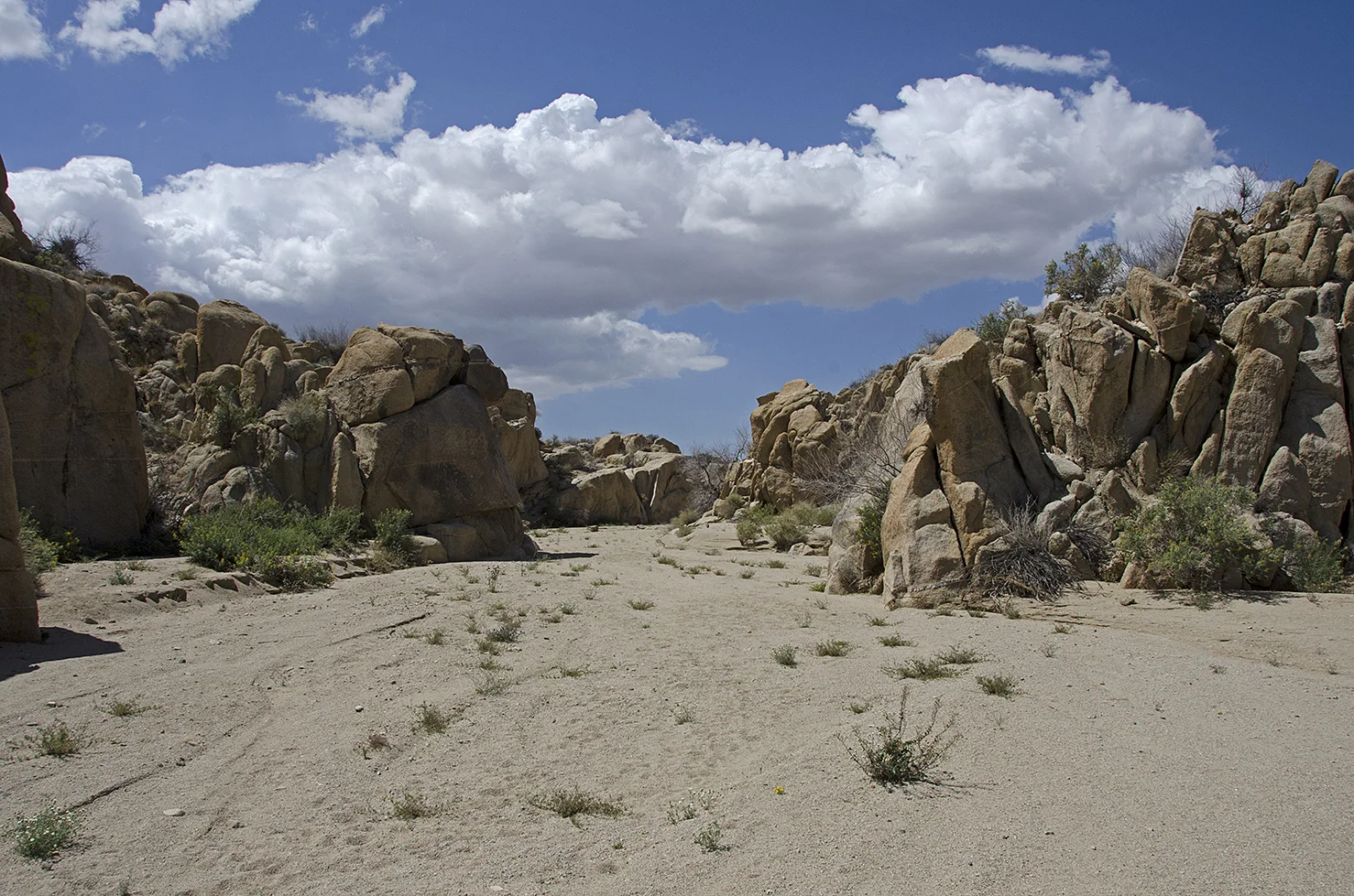 The wash narrows down for about a tenth of a mile, with rocky outcroppings on both sides of the channel. The evidence of water rushing through here can be seen on both sides, where it has cut into the rocks, left high sandbanks, and deposited large rocks in places they normally wouldn't be.