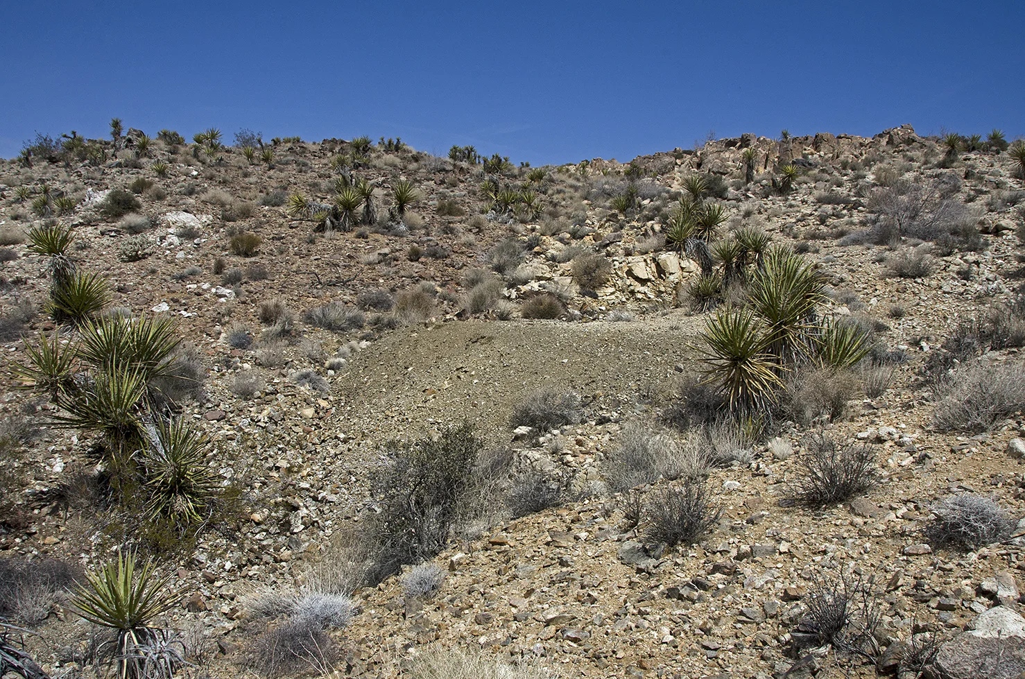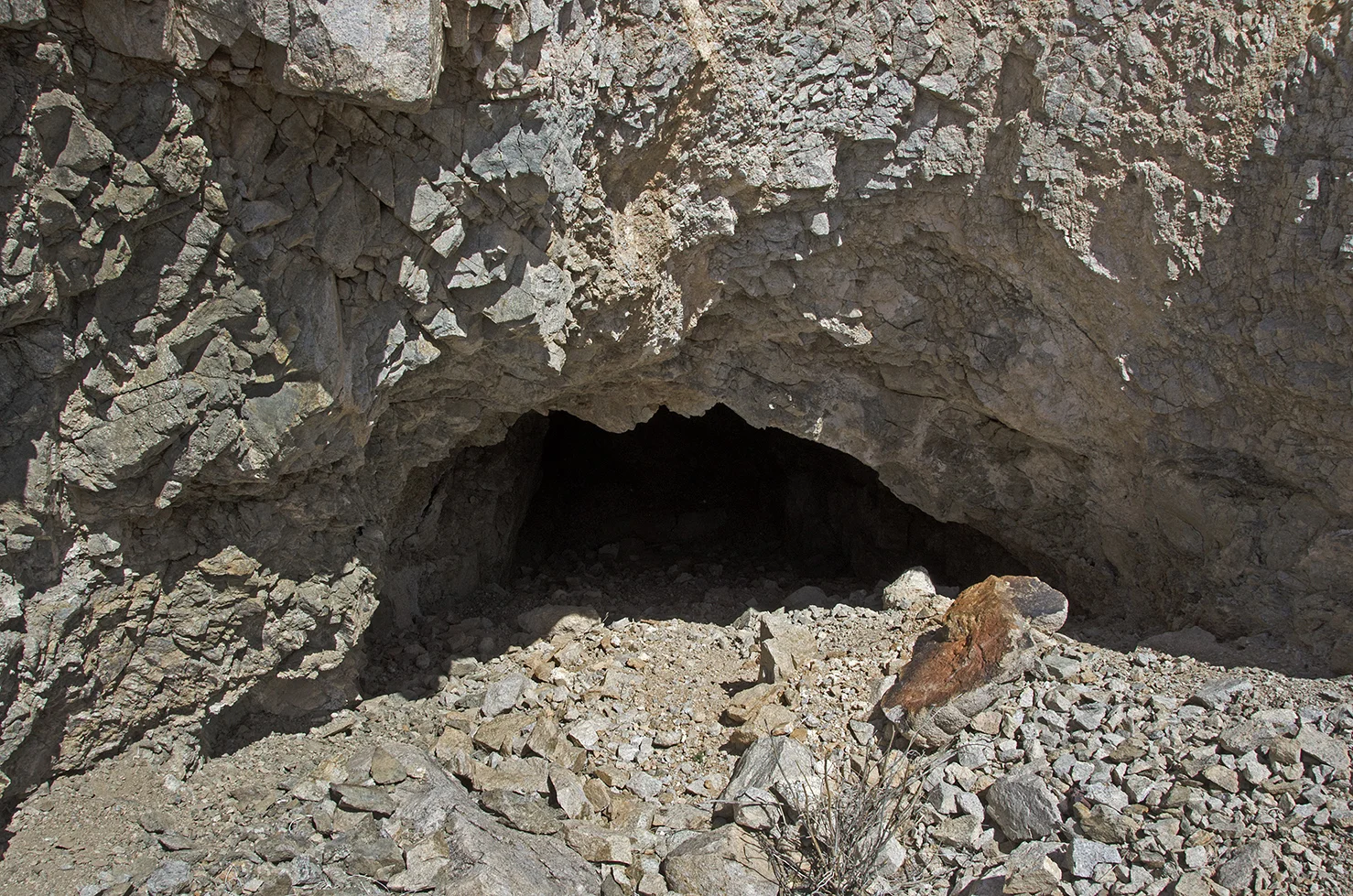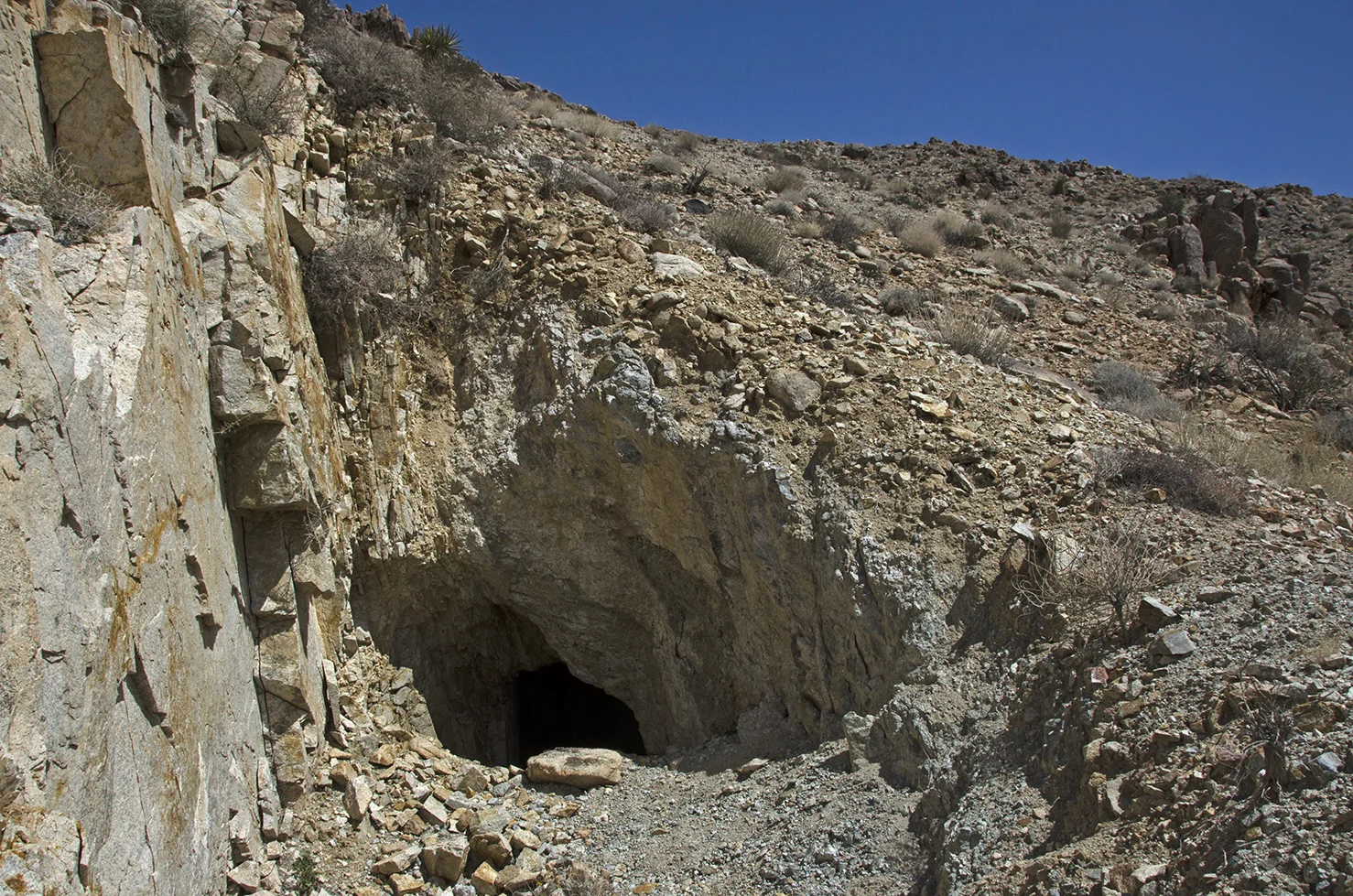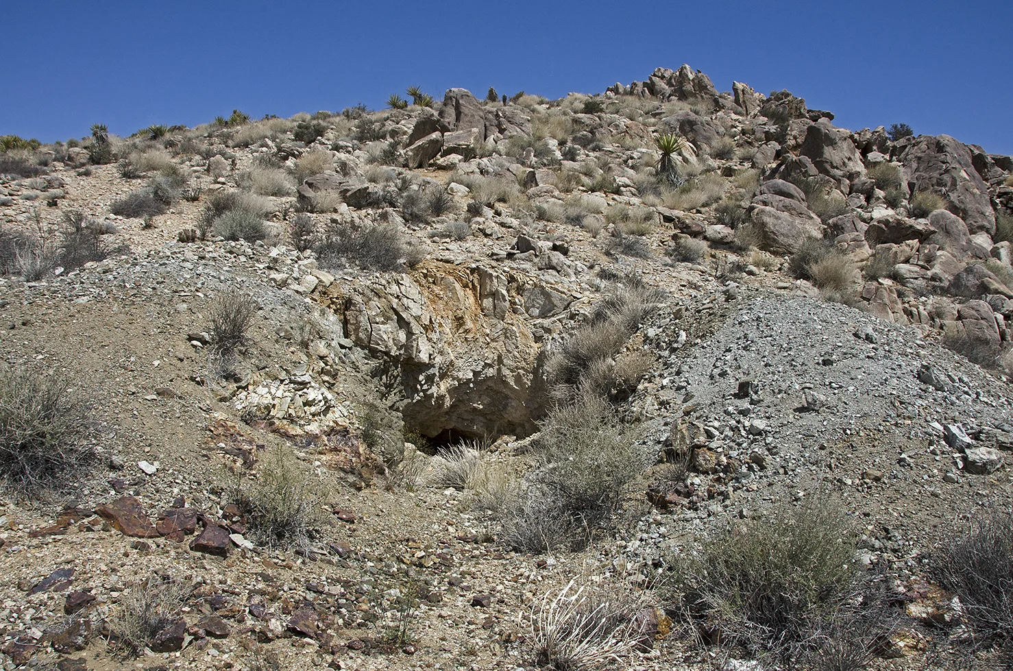 There are four small, inclined mine shafts in the Pinto Wye area. This one is located approximately 100 feet upslope of the arrastra. The others are the ones I hiked past on my journey here, the most distant one being about a half mile away. This shaft goes back about twenty feet or so, and produced a good pile of tailings out front. With the relatively small amount of work done at these four shafts, however, it's quite possible that the arrastra was built as a temporary test mill. Had the claims proved rich, the ore would most likely have been transported to one of the larger mills in the area.