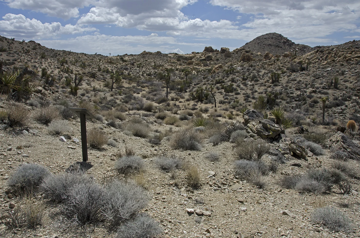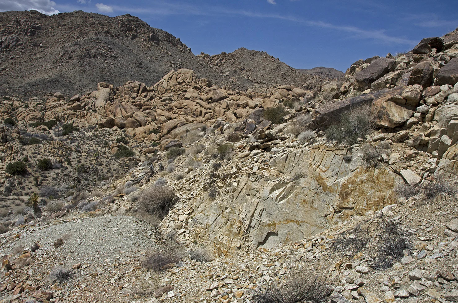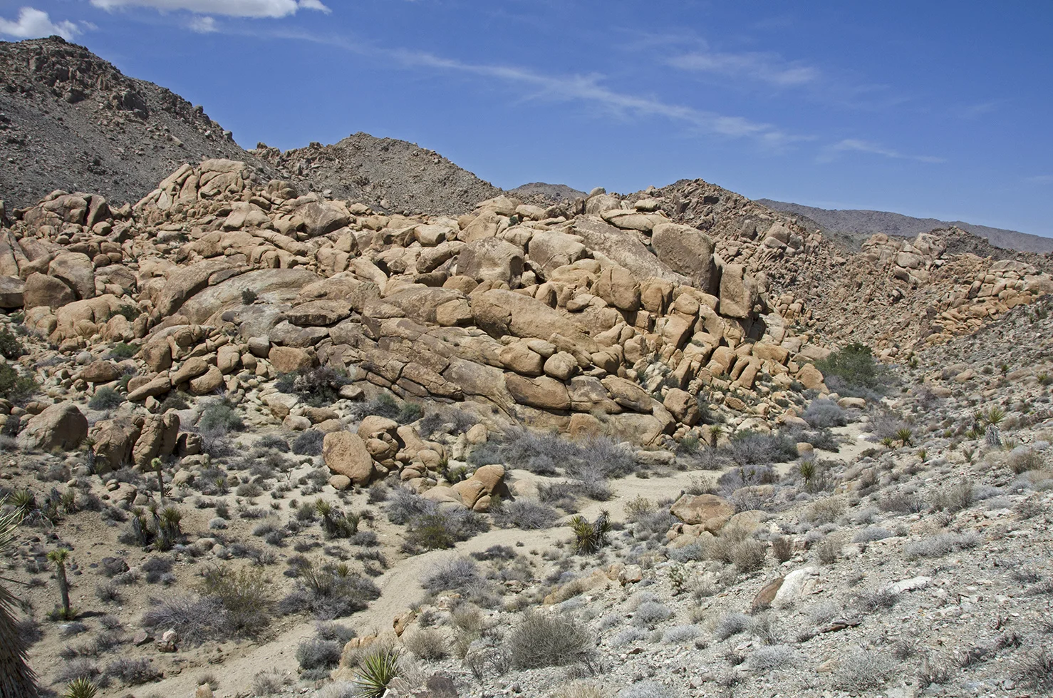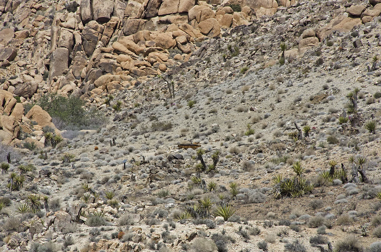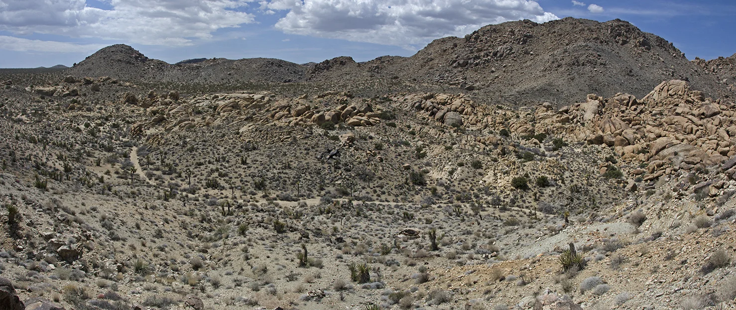 Five years ago I was five years younger, and took a more strenuous approach to the arrastra than I wanted to attempt this time around. So I parked at a convenient turnout located a tenth mile north of the Pinto Wye and then walked two tenths of a mile along the road to the really big wash that crosses, and periodically washes out, that section of Park Blvd. The summer storms of 2013 wreaked havoc here and proved how devastating flash floods can be. They wiped out the road, effectively closing the north entrance into the park for several months. This wash would be my entrance and exit for the trip to the arrastra.