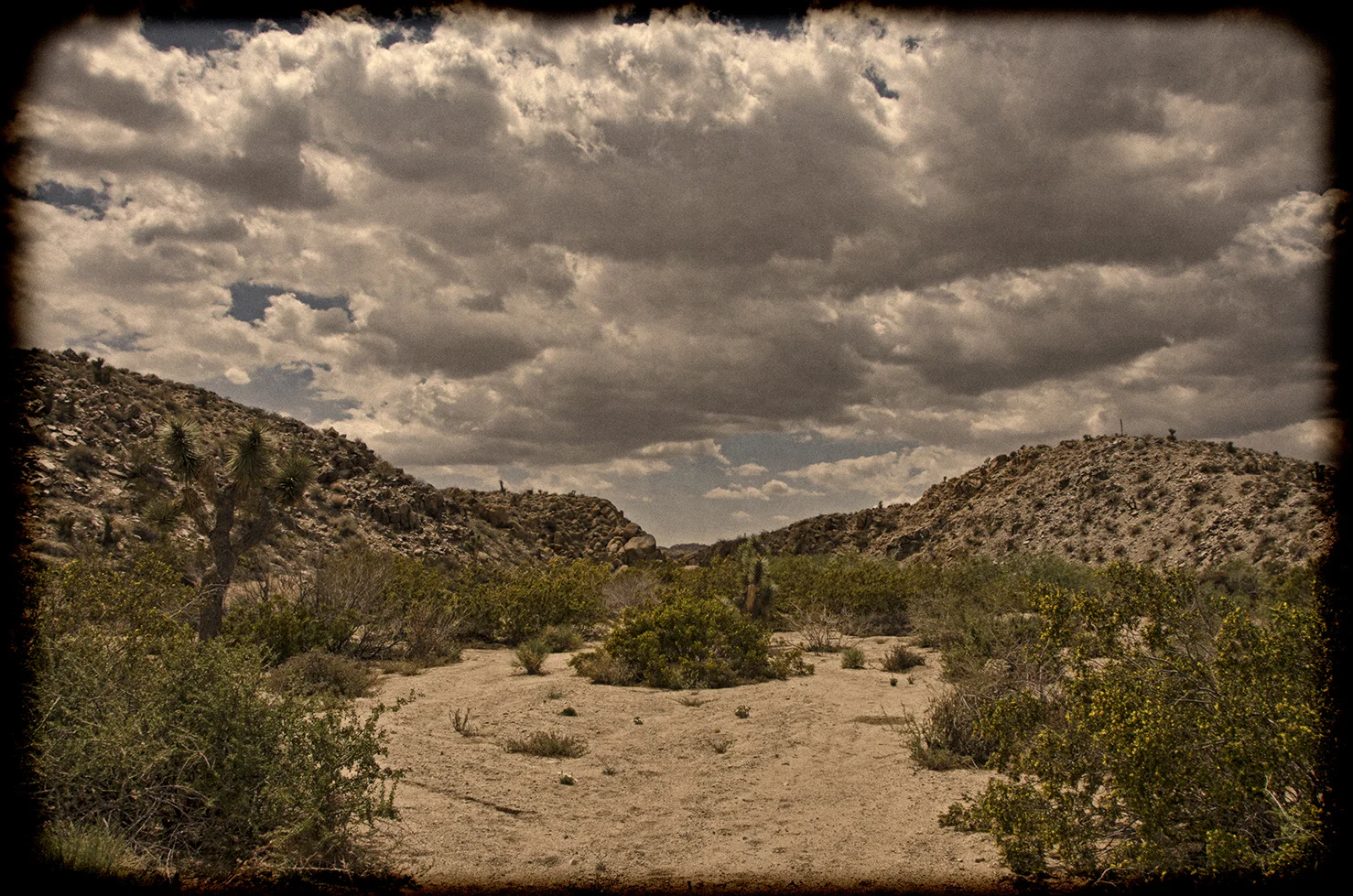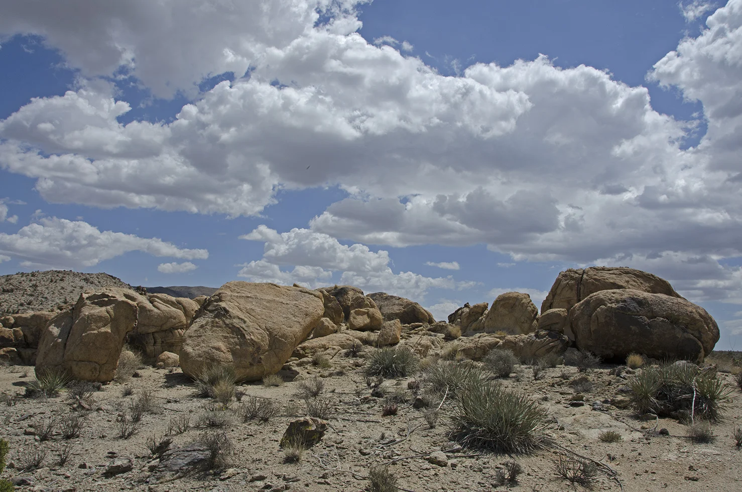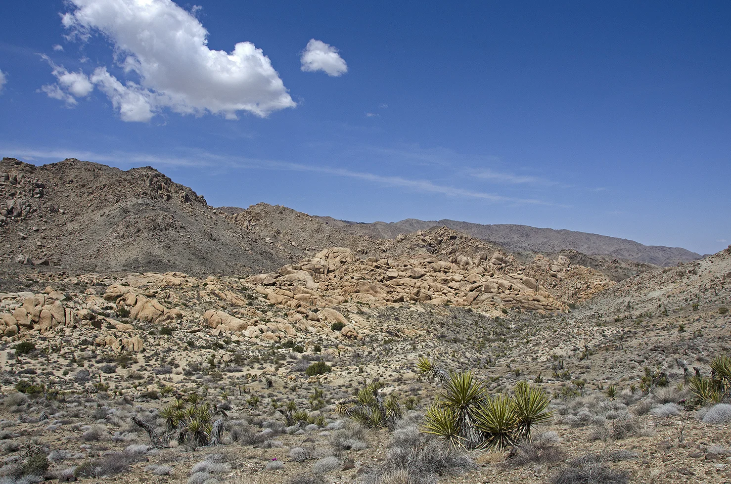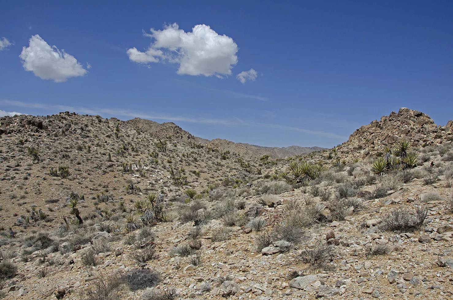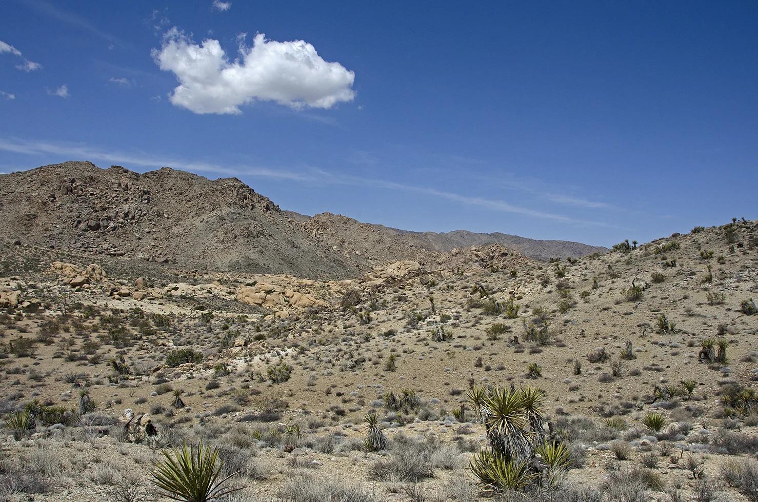 Five years ago I was five years younger, and took a more strenuous approach to the arrastra than I wanted to attempt this time around. So I parked at a convenient turnout located a tenth mile north of the Pinto Wye and then walked two tenths of a mile along the road to the really big wash that crosses, and periodically washes out, that section of Park Blvd. The summer storms of 2013 wreaked havoc here and proved how devastating flash floods can be. They wiped out the road, effectively closing the north entrance into the park for several months. This wash would be my entrance and exit for the trip to the arrastra.