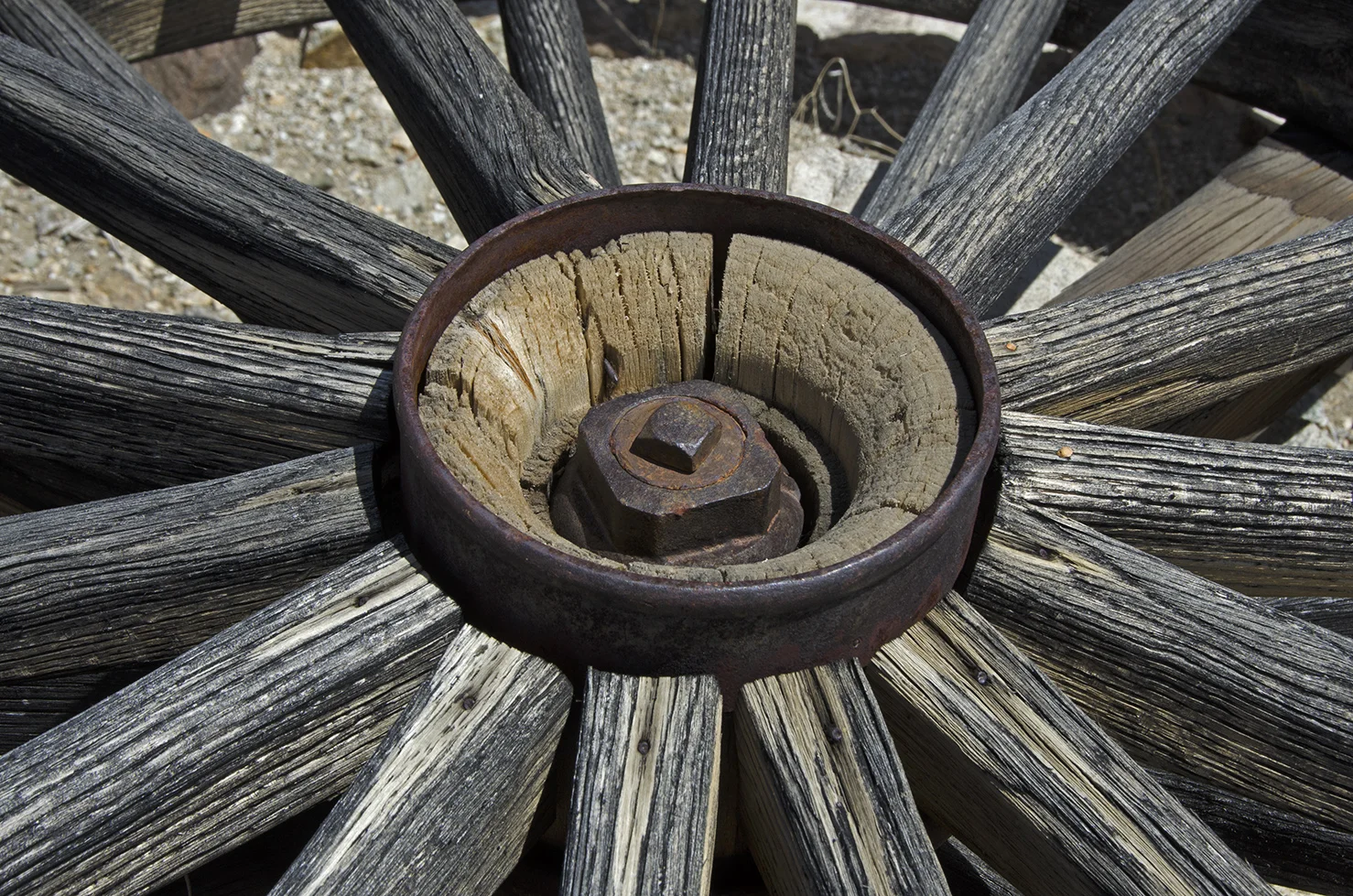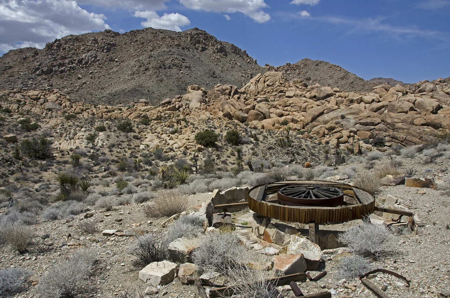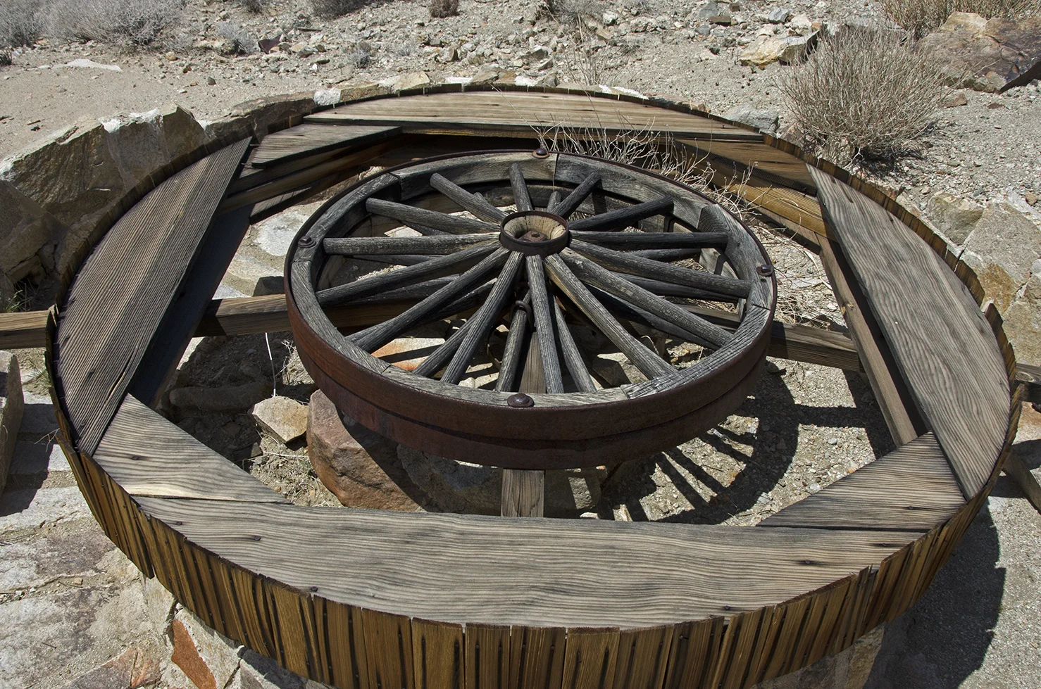 The builder of this wagon wheel arrastra is unknown. It was probably used in the 1930s. The arrastra was powered with a gasoline engine, using a belt around the central wheel. Earlier arrastras were usually powered with animals, steam, or water.