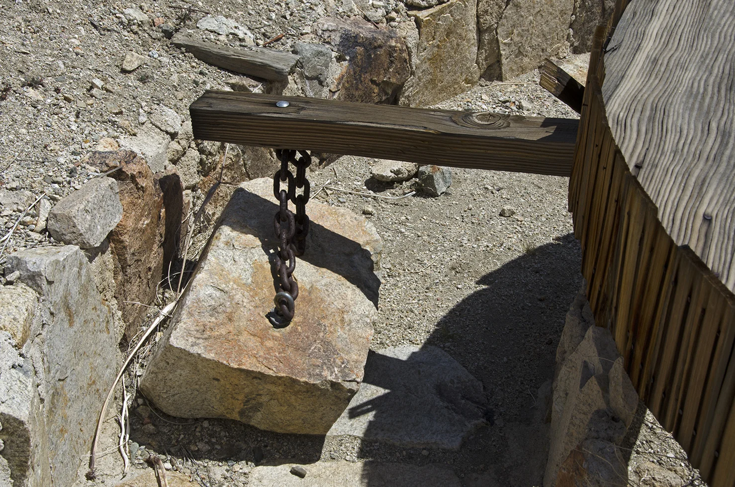 The engine that once powered the arrastra is long gone, it was a four-horsepower International upright gasoline engine. It drove the belt that spun the arrastra.
