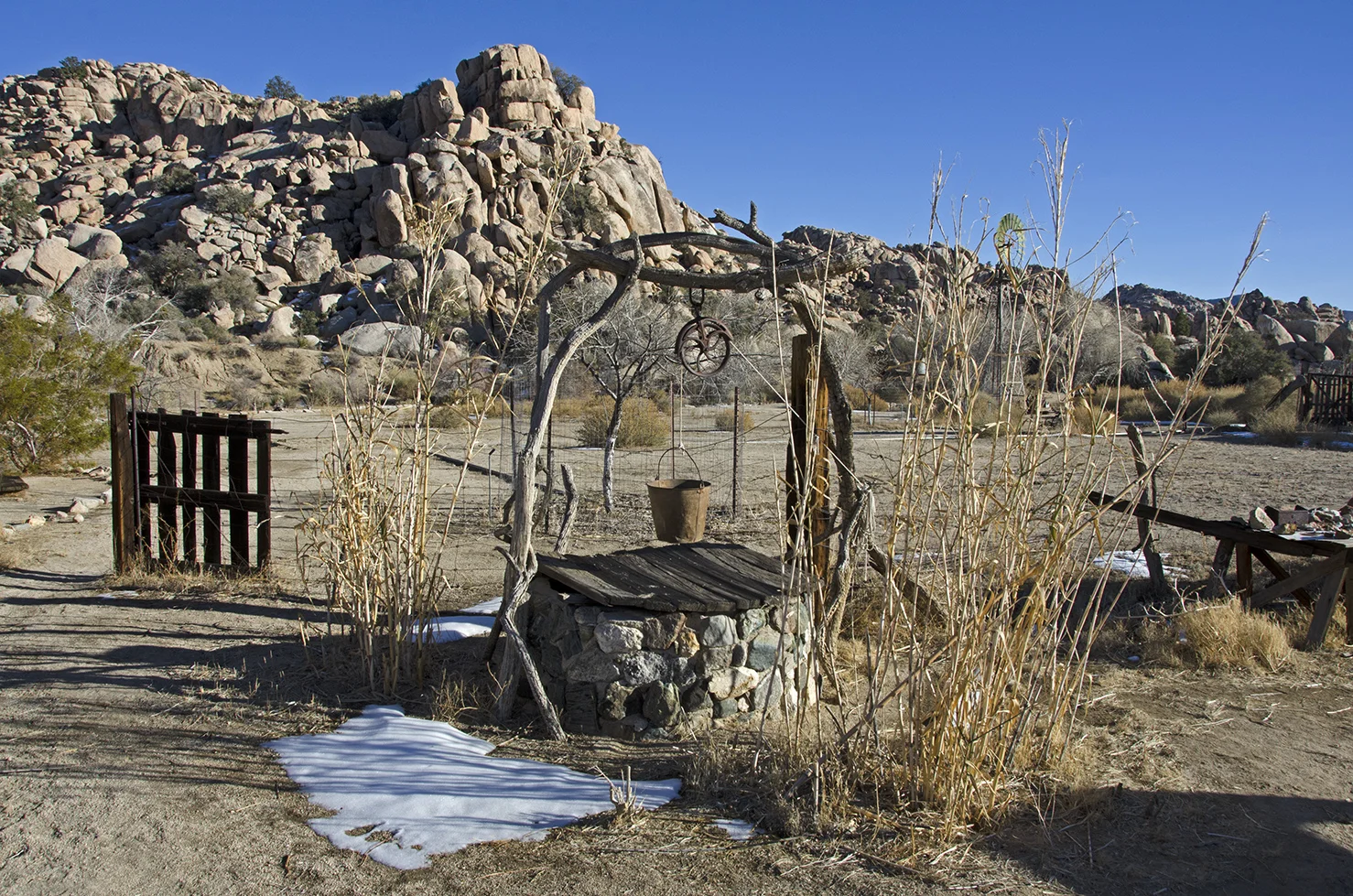 #2 marks one end of an old fence constructed of Joshua Tree trunks. I missed getting a photo of that one. However, the stick corral nearby has a few Joshua Tree logs in it.