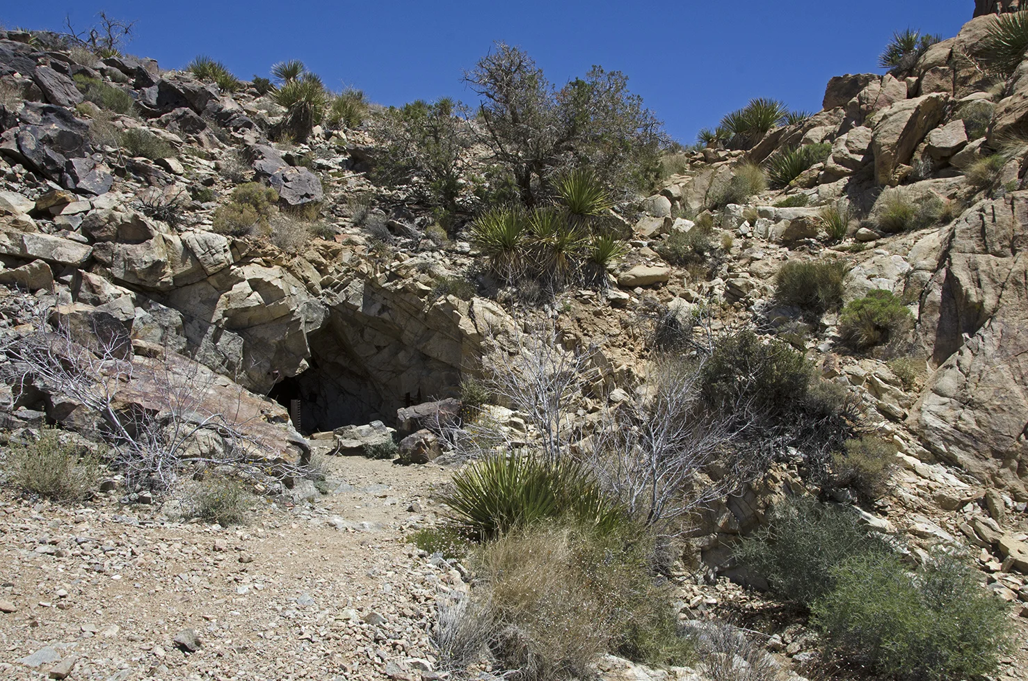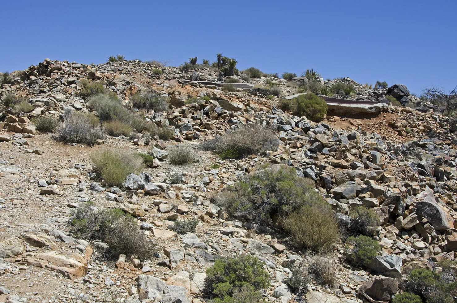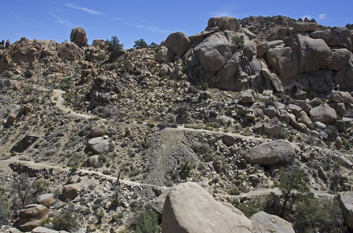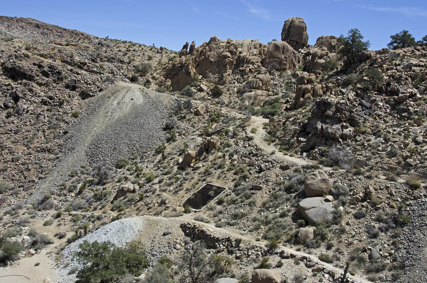 The rocky road leading up to the main workings of the Desert Queen Mine. There are several small adits along the road; some are caved in, some go into the sold rock only a few feet. Whatever prompted the exploration in these small tunnels apparently didn't pan out.