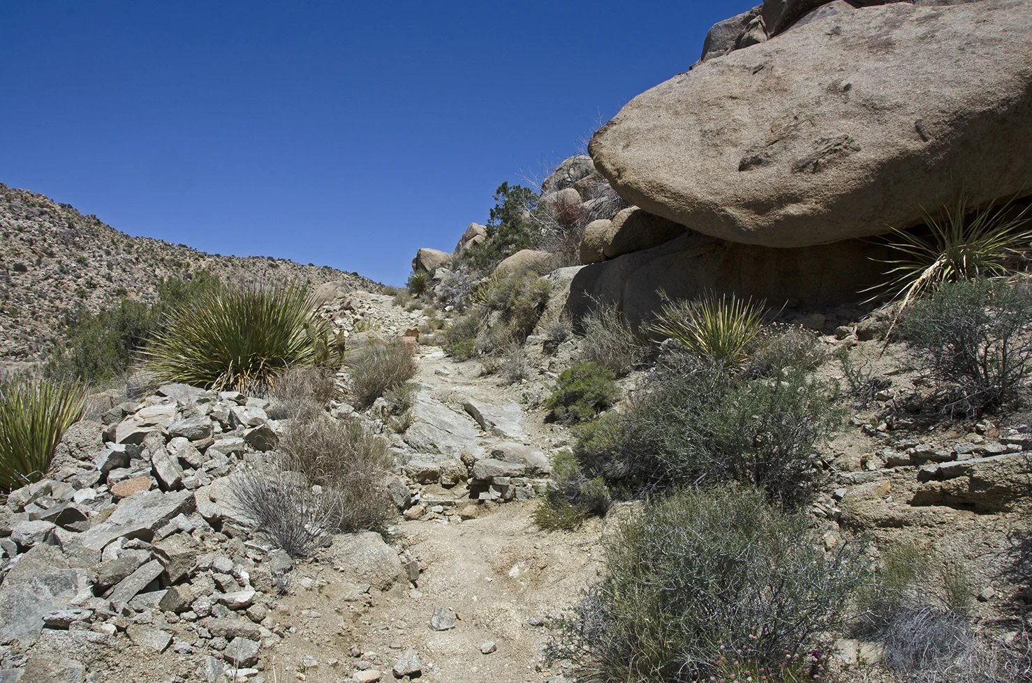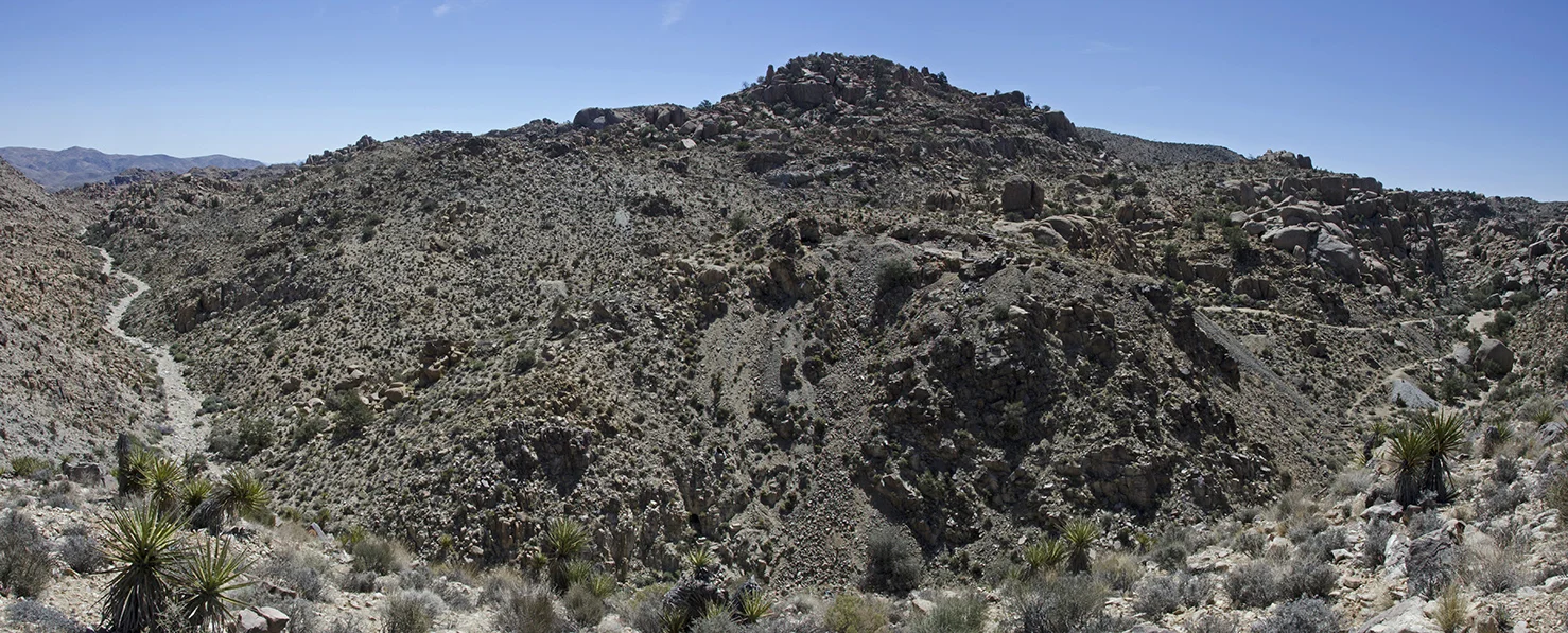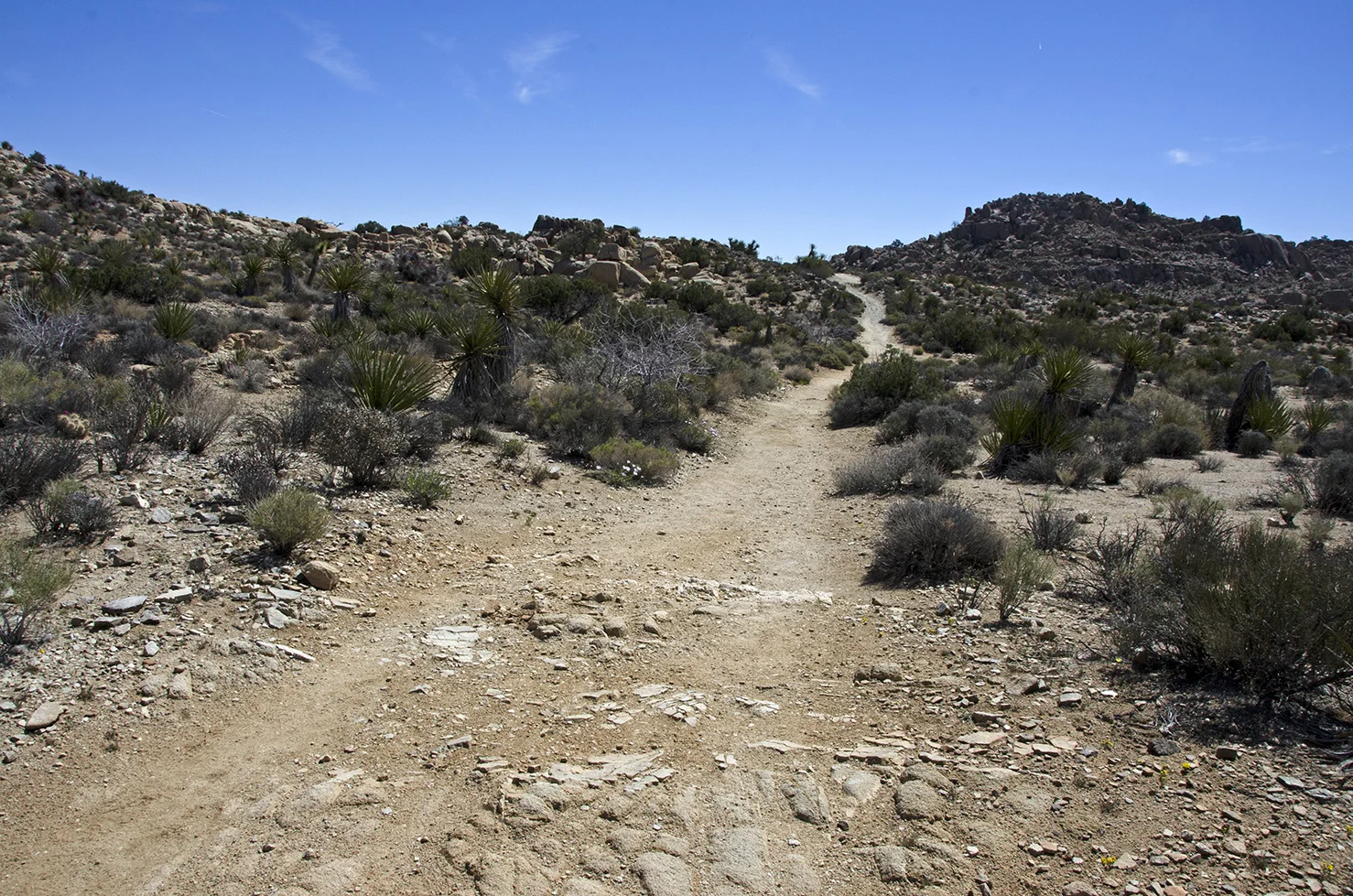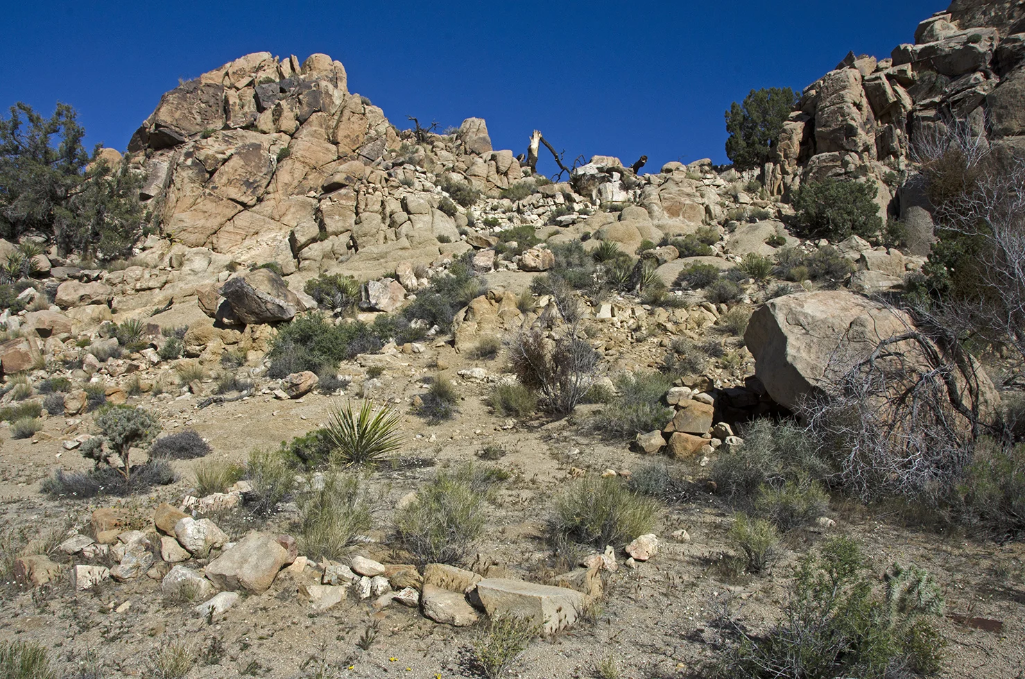 The rocky road leading up to the main workings of the Desert Queen Mine. There are several small adits along the road; some are caved in, some go into the sold rock only a few feet. Whatever prompted the exploration in these small tunnels apparently didn't pan out.