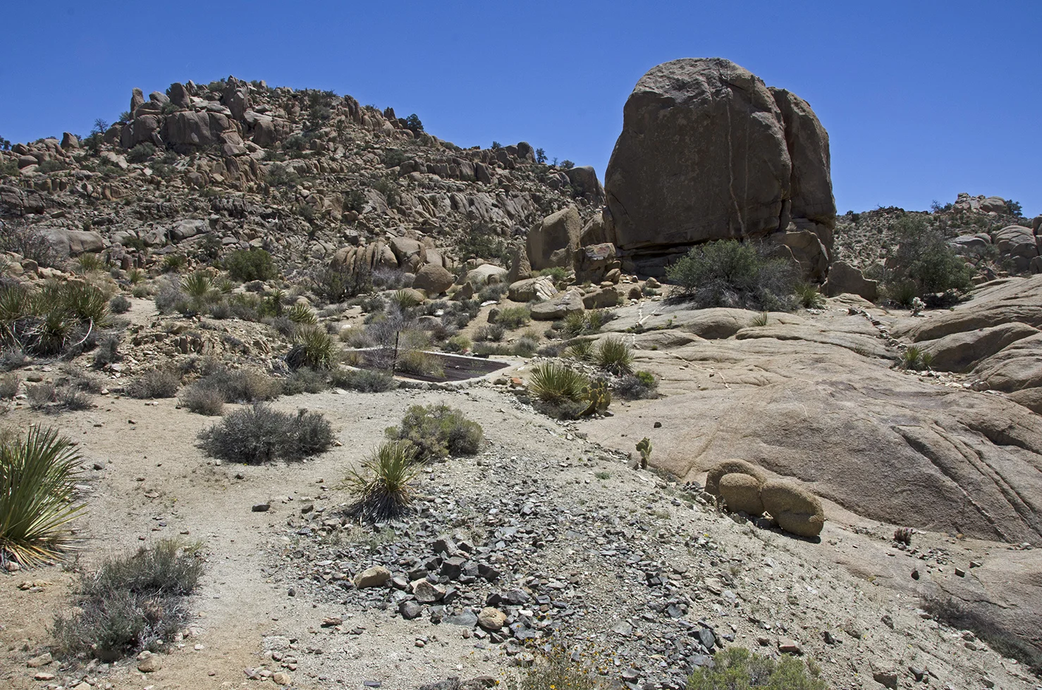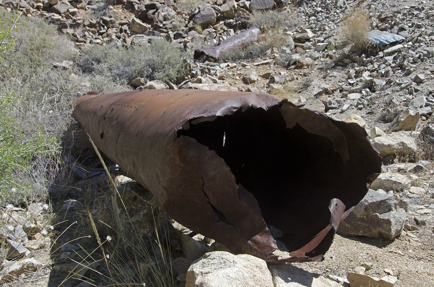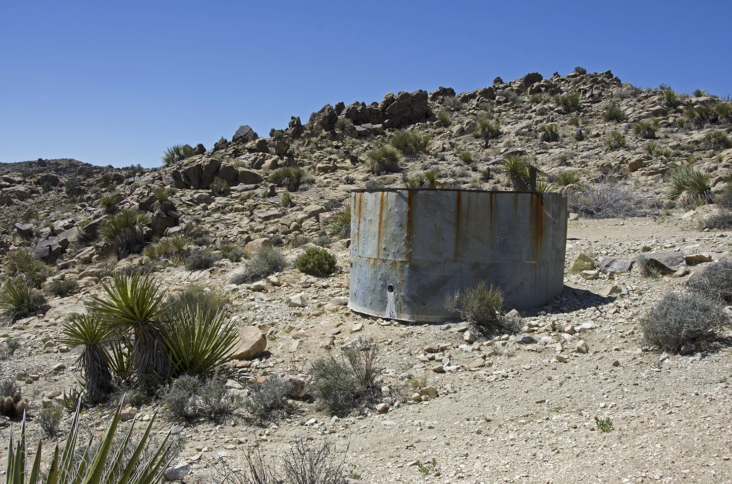 Heading back south from the overlook, there's another relic from the days of J Tree gold, one of two old cyanide tanks that are still mostly intact, albeit full of bullet holes. Cyanide was used to extract gold from low-grade ore that had been reduced to a slushy slurry. It was a nasty business and could prove deadly.