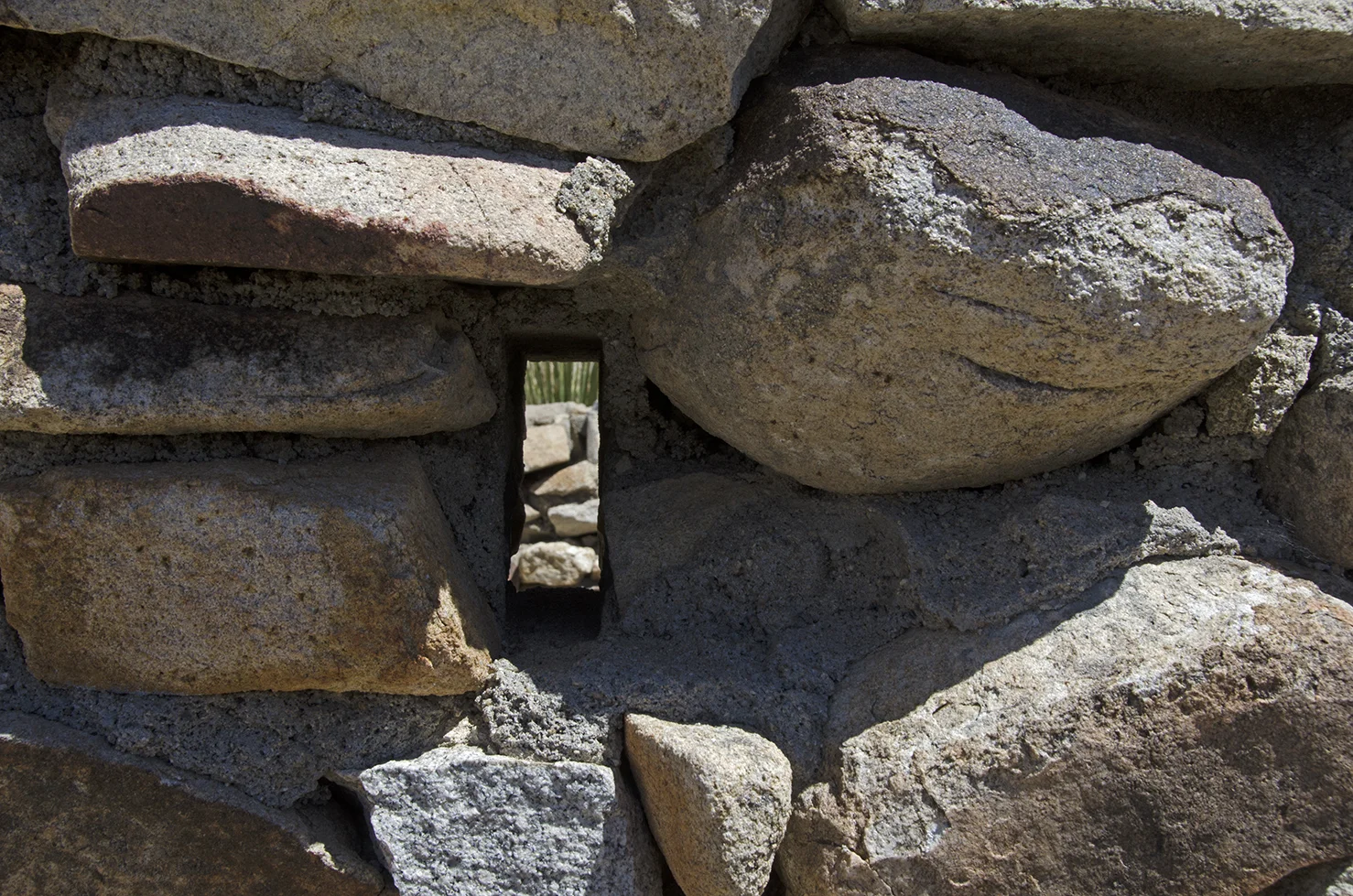 There are two small openings in the front wall of the cabin, which I'm pretty sure were for protection, as they look like rifle slots to me. Perhaps gold ore was stored in the building and these opening were used to take care of any varmints trying to sneak up and rob the place.