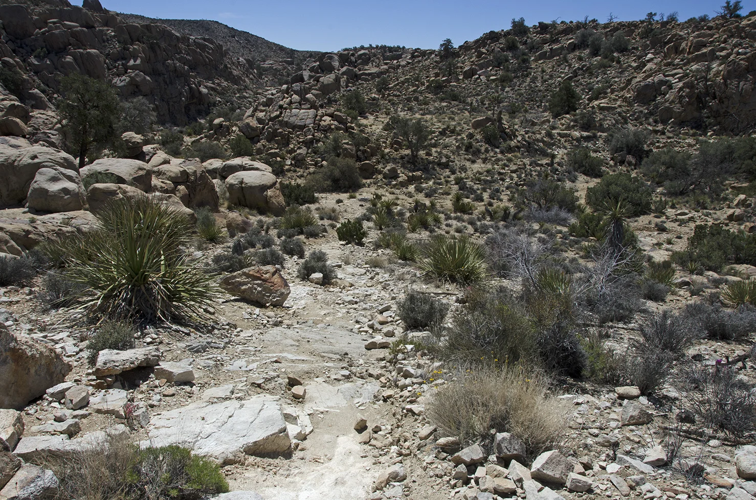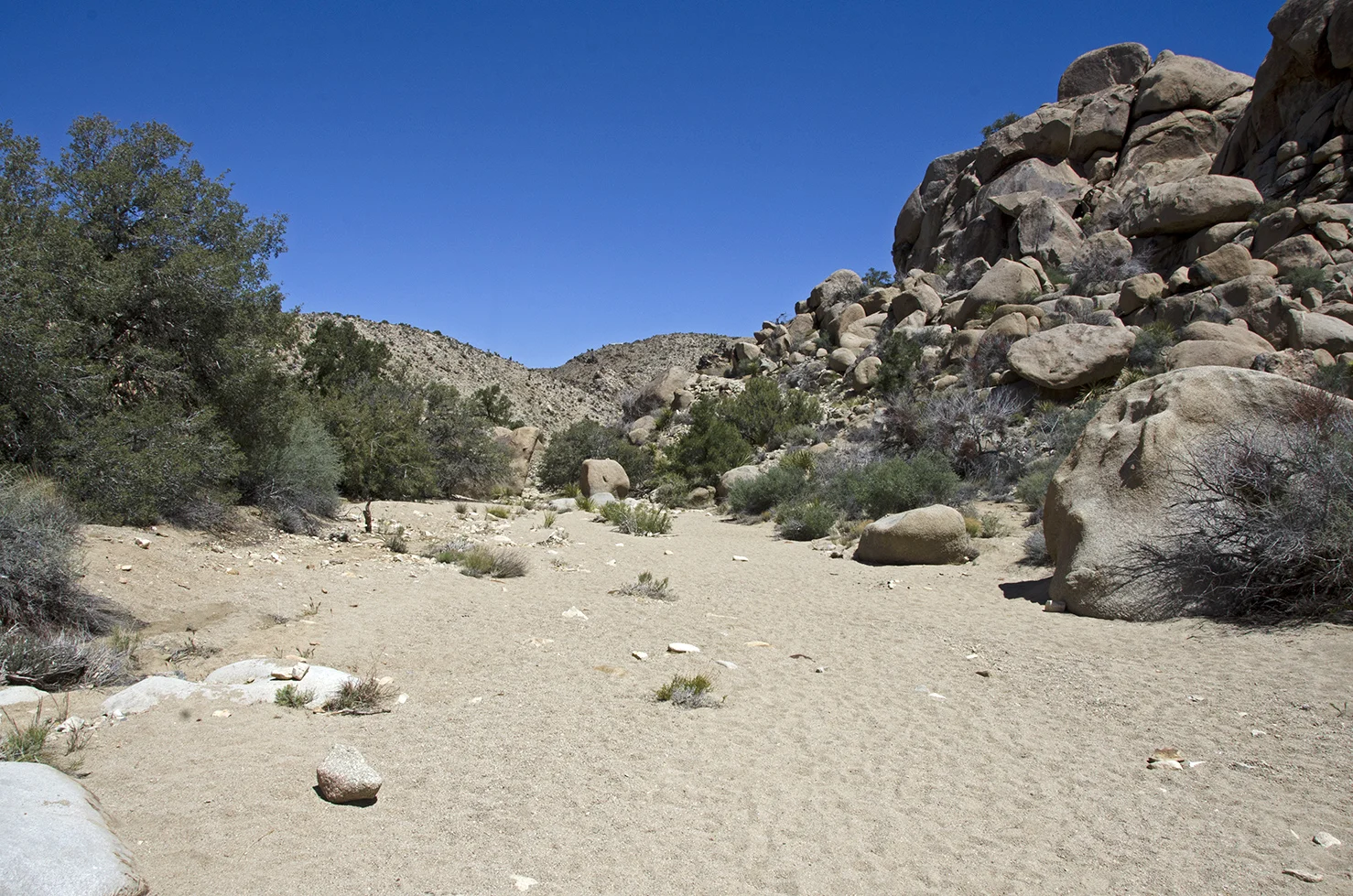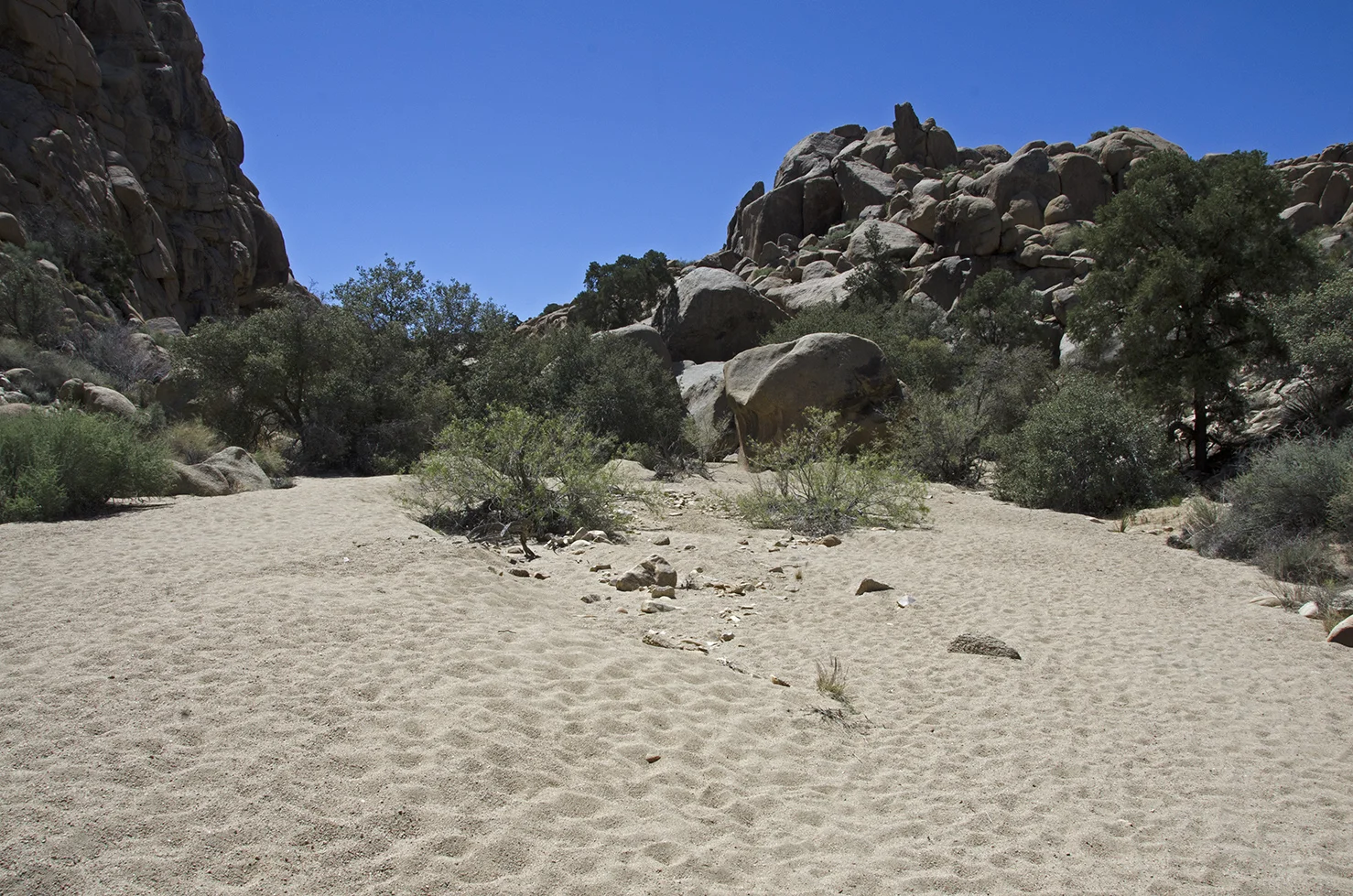 Nearing the bottom of the wash, a nice look at some climbing rocks straight ahead. Can you spot the Gold Nuggets, the Tailings and Poodle Rock?