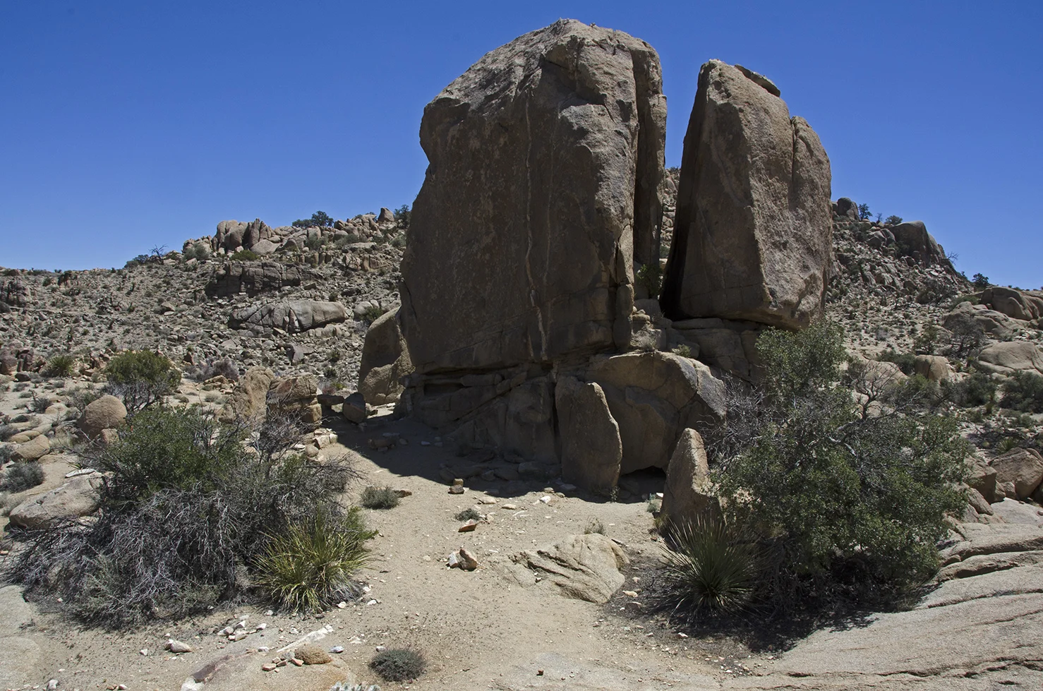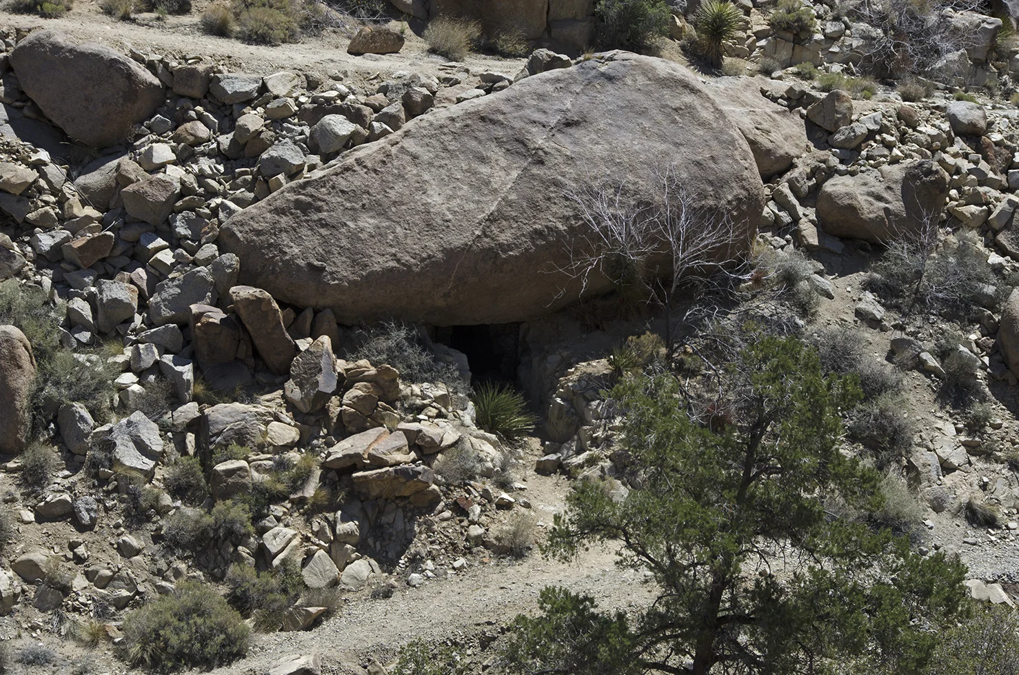This huge boulder is just above the bottom of the wash and below the road that leads up to the mine workings. That dark hole underneath? Yes, it's a mine entrance. We'll arrive there soon.