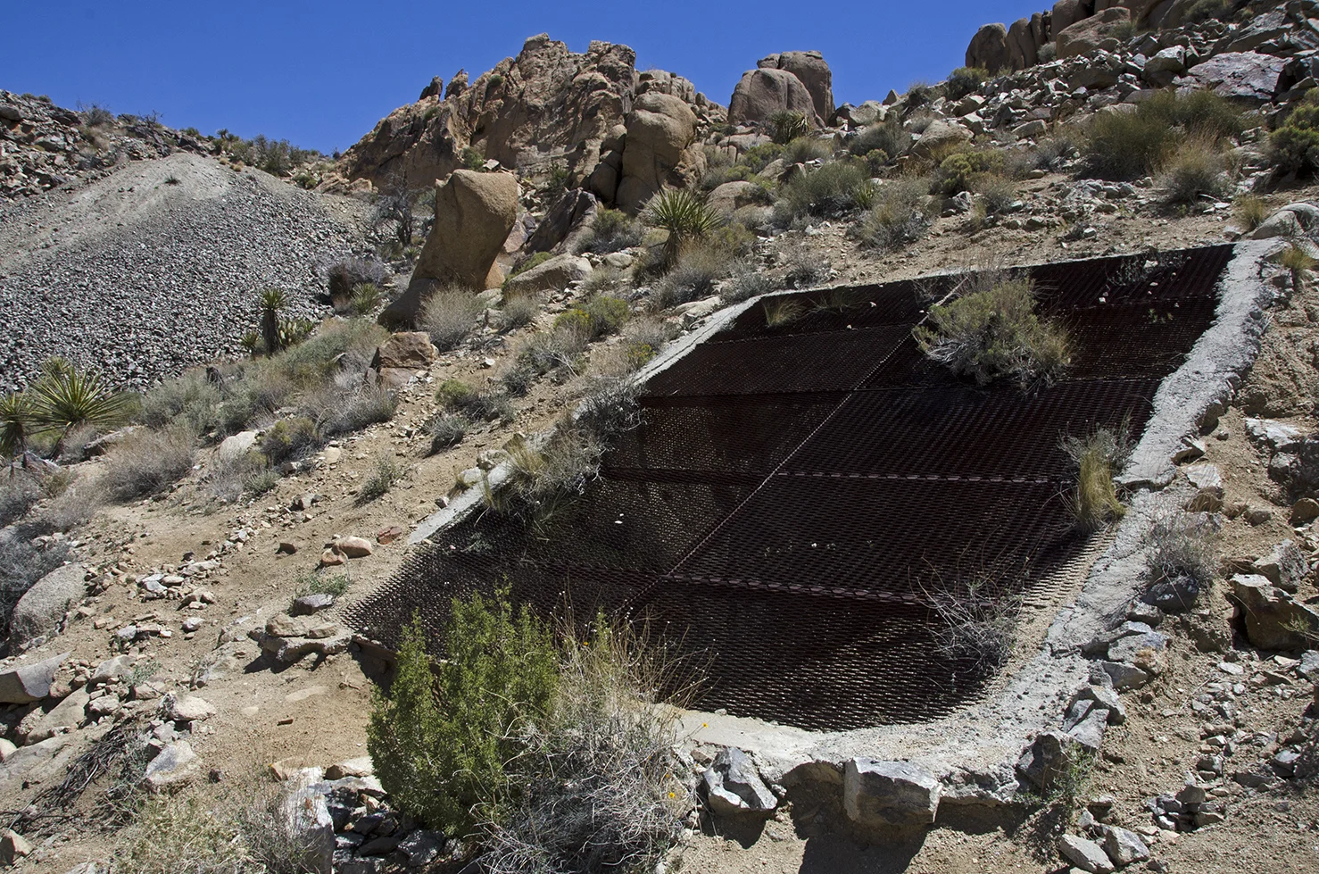 This nice view opens up once the road reaches the west ridge above the wash. That's a big pile of tailings and a great shot of one of the many grates. If you're interested in finding mines to poke into and explore, most of the mines in J Tree will disappoint in that regards. The Park Service has either grated, caved in, closed off or otherwise made entry into the great majority impossible. Which to me is sad, but probably necessary.