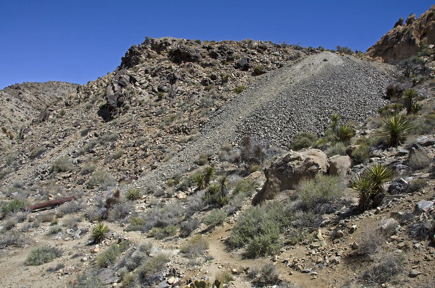 During a detailed mine survey taken in 1976, the Desert Queen was recorded as having "four large vertical shafts, five inclined shafts, and ten adits, five of which had started caving." Hiking around the area, I think they may have missed a couple. This is the main tailing pile and it is about sixty-five feet tall. That's a lot of rock.