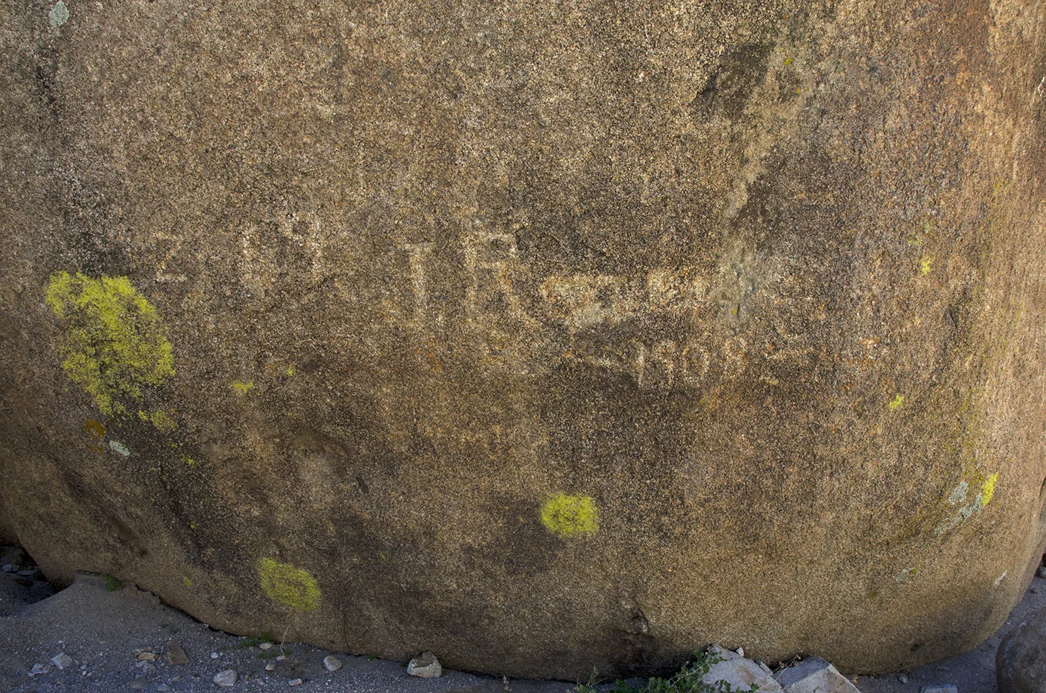 Hiking back south in the wash to access the road leading up to the main workings, we passed several very large boulders. This one has some old initials etched into it, apparently by someone with the initials, "I.R." and then a name I couldn't make out. The date stands out plain, 1908. Was this inscribed by one of the early day miners?