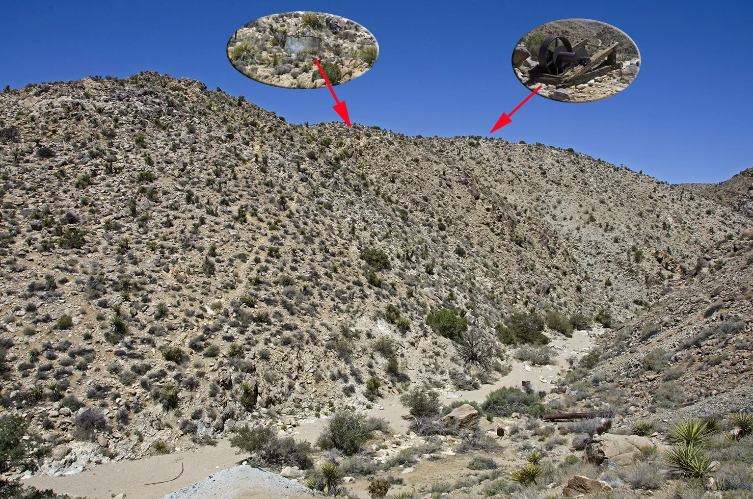 While up on top of the ridge at the beginning of this trek, I had spotted the other cyanide tank and miscellaneous mining debris a little farther north of where these two photos were taken. I had never hiked past this spot on previous trips, and since the day was young, I decided to see what I could find around the bend.