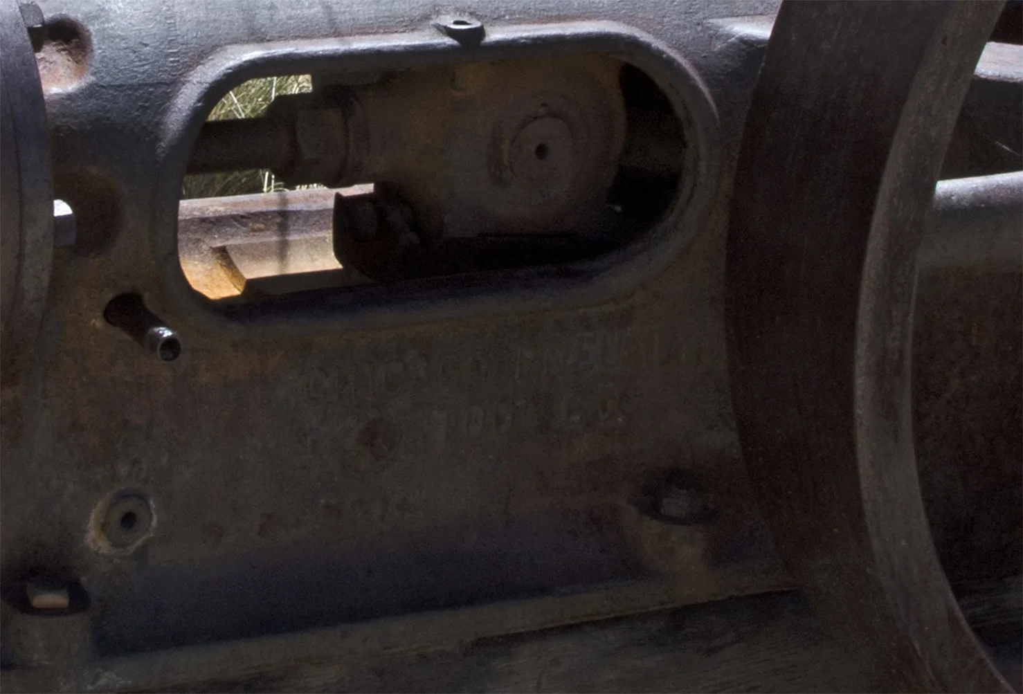 An air compressor and reservoir mounted on large wooden beams rests alongside the road, very near the top of the large tailings pile. "Chicago Pnuematic Tool Co." is embossed on one side of the compressor. This must have seen a lot of work during the mines operating years.