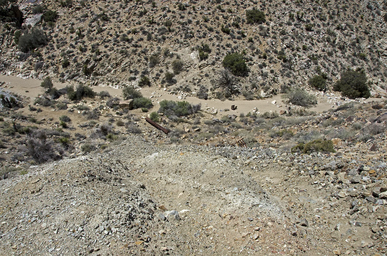 Looking down from the top of the main tailings pile. It's quite a slippery slope. That's a lot of rock and debris. I wonder where it all came from....