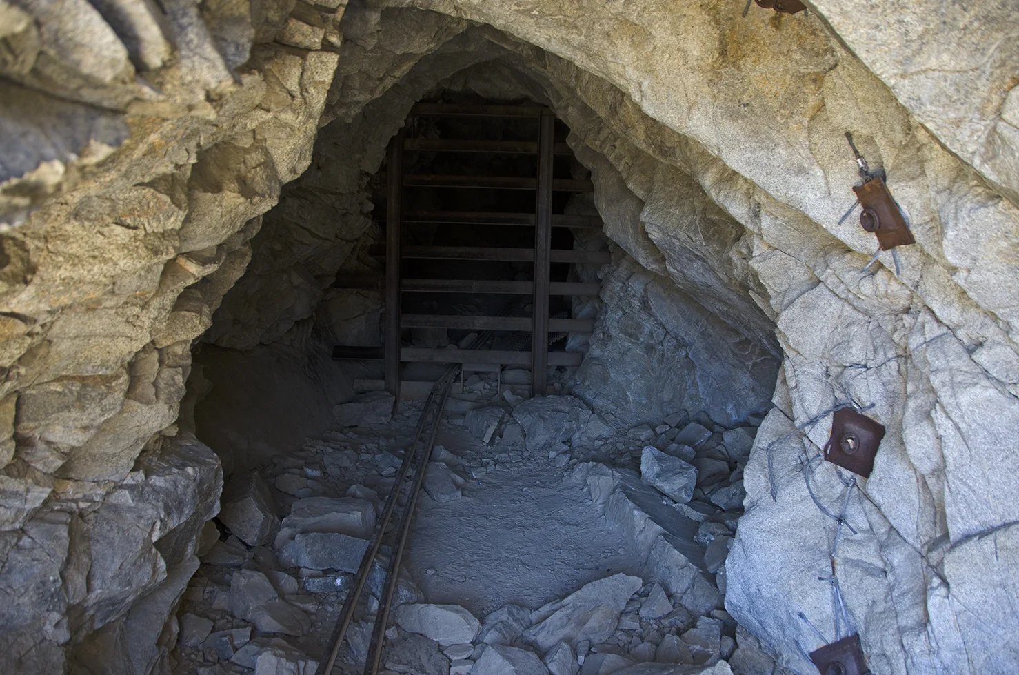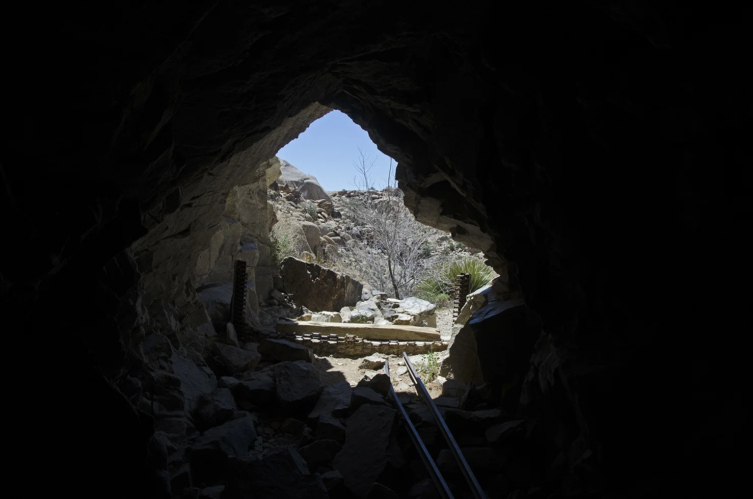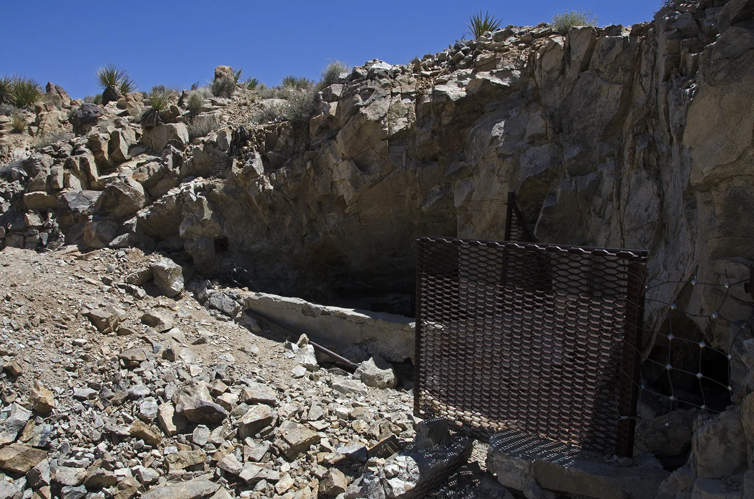 I'm not sure, but I think this may have been one of the main workings of the Desert Queen Mine. This tunnel has been gated for safety. A couple of the mine cart rails still lead into its depths.