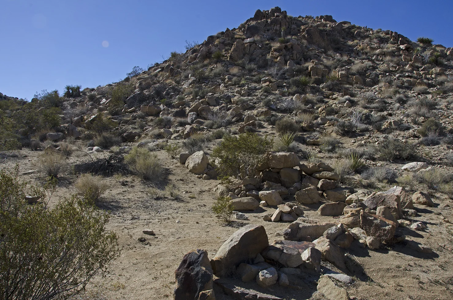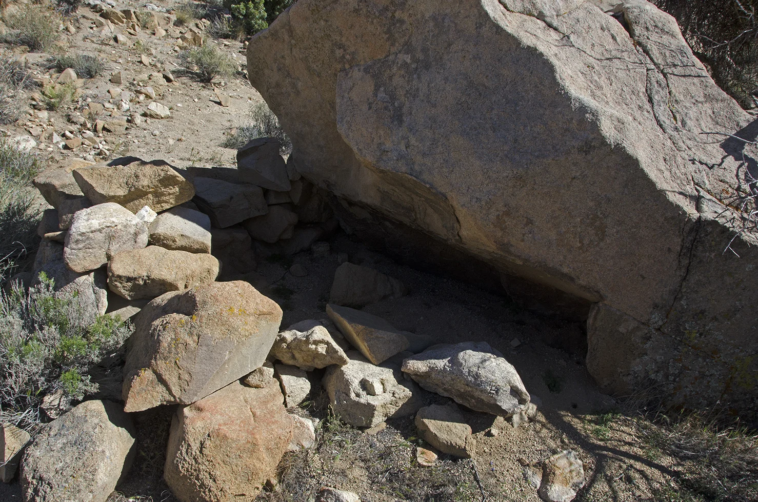 On the hike back to the parking area, Murbachi talked me into following a different fork of the road after we had crossed Gold Dust Gulch and started climbing up the trail. I had never explored this direction before, but we knew that it would loop back towards the parking area. After a bit of walking, several nice little plateaus opened up and off the road a bit I spotted something that was obviously created by man, it looked like a shelter of some kind.