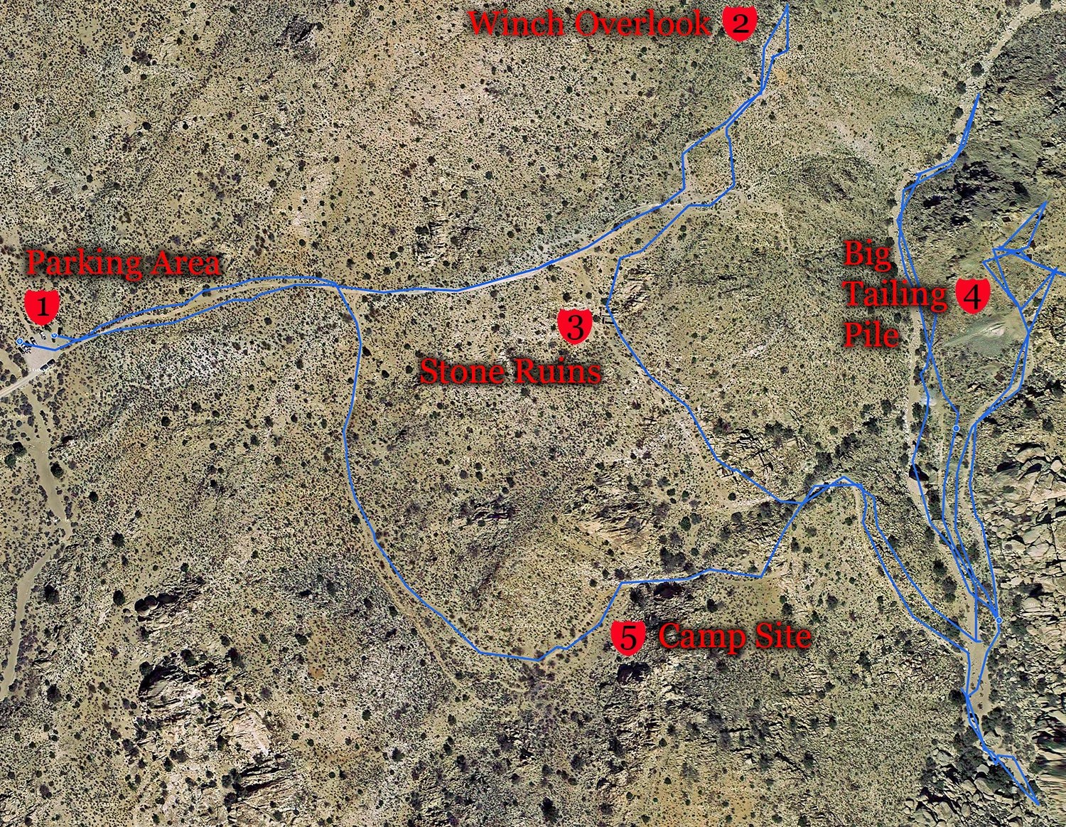 The view from up here is great. Look at all the mine workings. The wash immediately below this overlook is called "Gold Dust Gulch," which seems fitting enough. If you follow it downstream to the east, you'll eventually reach John's Camp and on the way you'll see this interesting sight. But that's from a hike on different day. Click HERE to read about where this old car is and the neat Boulder Cabin nearby.