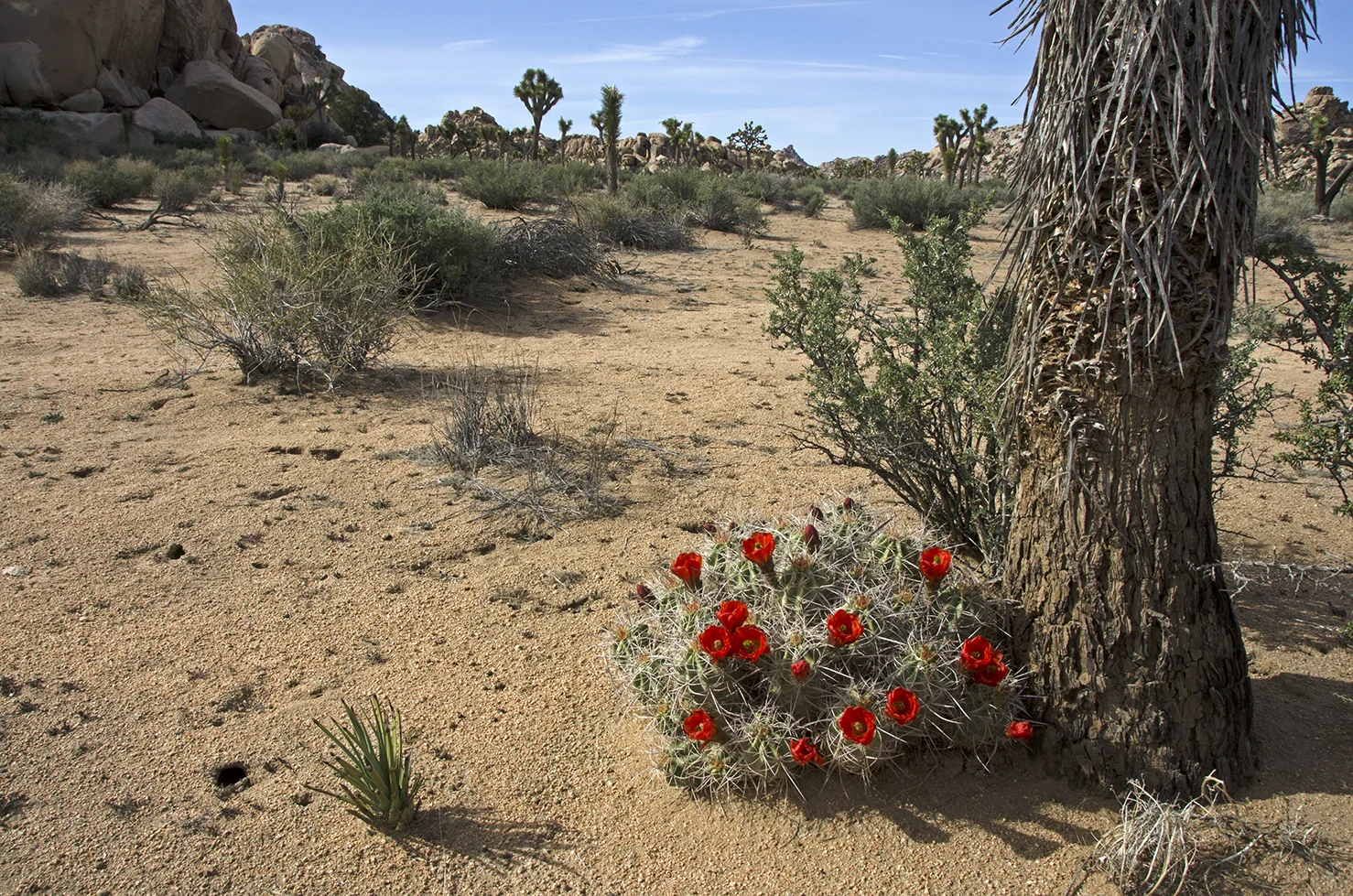 A Claret Cup Cactus was busy showing off. Any little bit of color really stands out while hiking in the desert, and me being curious, I can easily double the length of any hike by checking out everything that catches my eye. Note: see the baby Joshua tree to the left of the cactus?