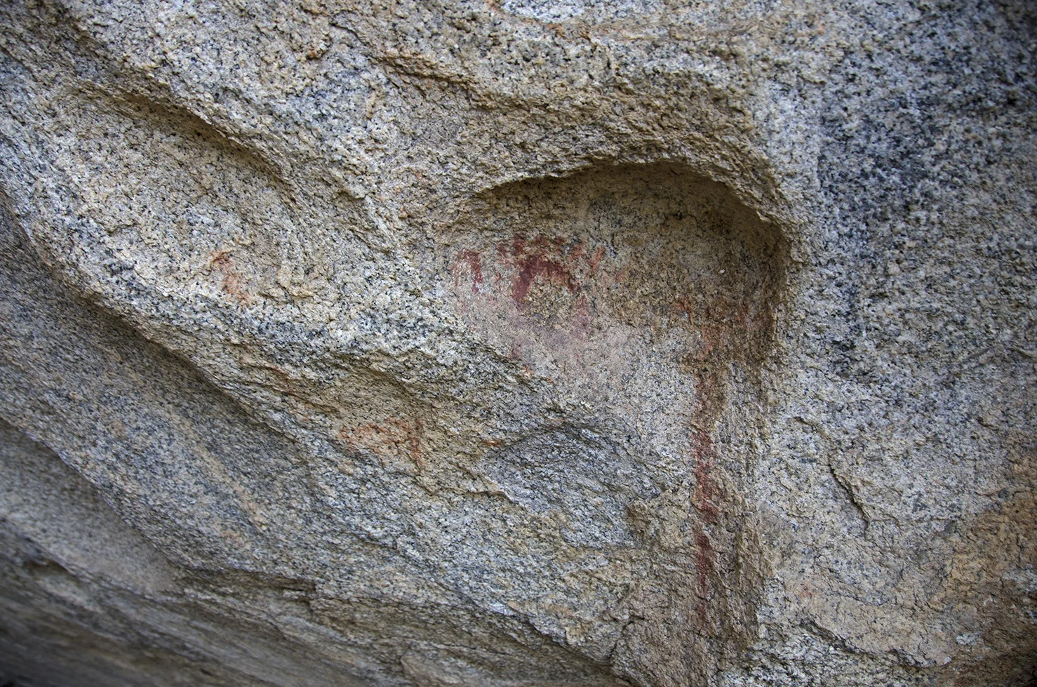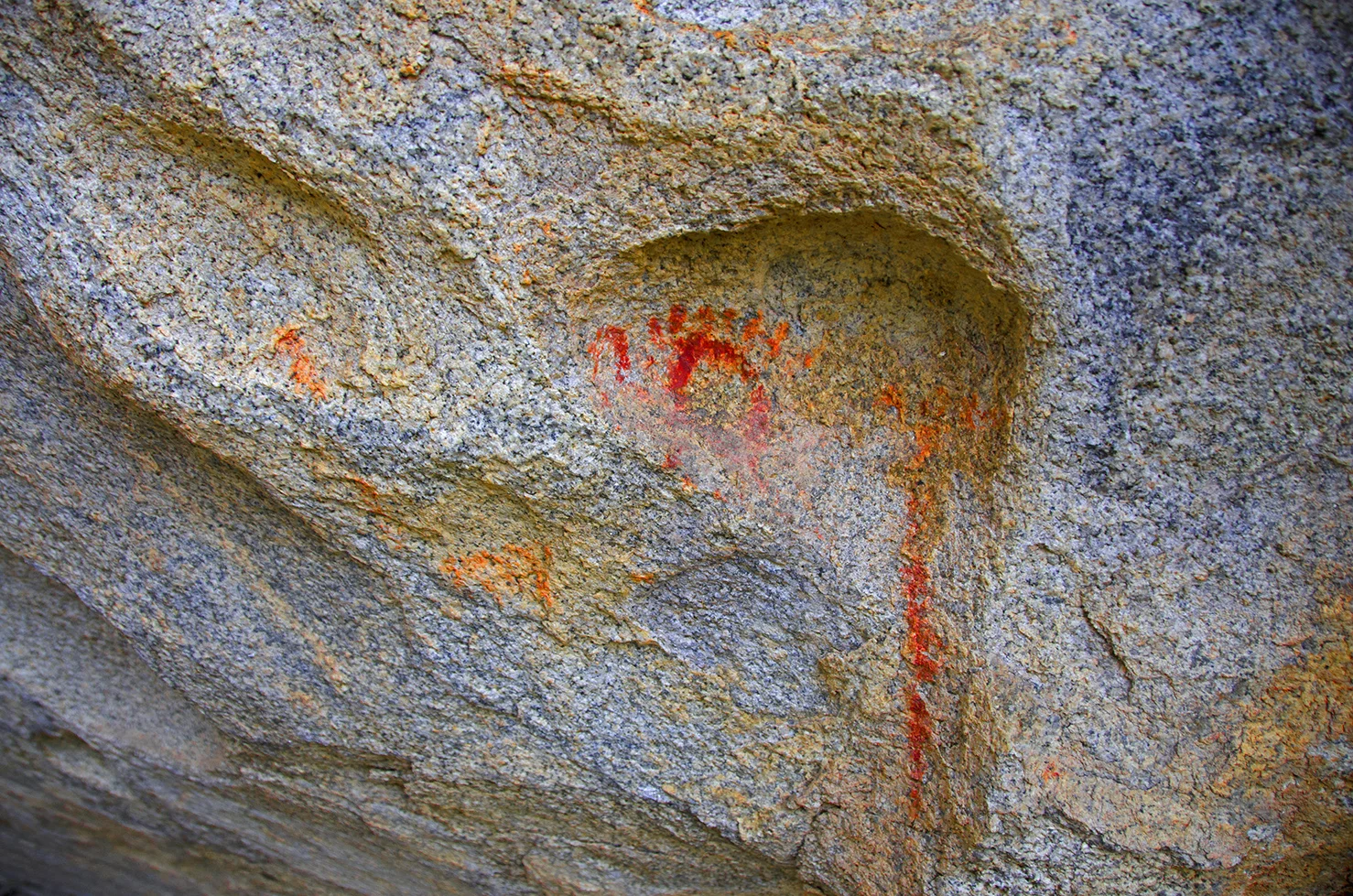 I eventually narrowed my search down to the right area and was rewarded by finding the site. There are only a few pictographs at this spot, and most are very faded. The above image is of the most visible pictograph. Here is my amateur attempt at enhancing the image to make the design more pronounced: