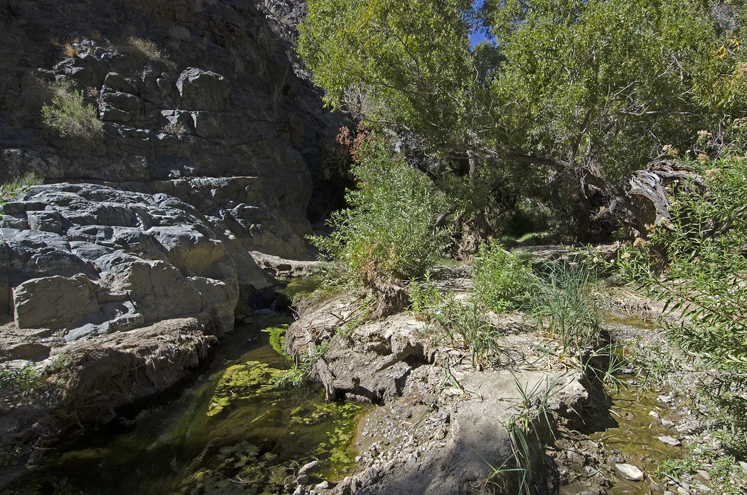 Soon after I began hiking, a small stream seemed to magically appear, which grew a bit larger the farther up-canyon I hiked. Around the two-thirds-of-a-mile mark, the canyon began to close in on me and the vegetation became quite lush. Lots of green stuff, cottonwoods and willows, it was a pretty amazing transformation. All because of water.