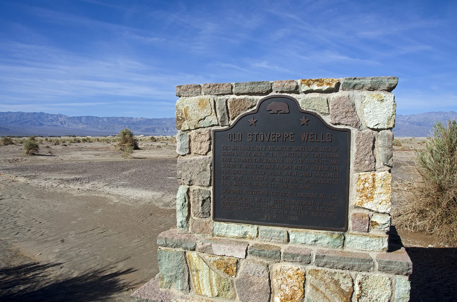 "This waterhole, only one in the sand dune area of Death Valley, was at the junction of two Indian trails. During the bonanza days of Rhyolite and Skidoo, it was the only known water source on the Cross-Valley road. When sand obscured the spot, a length of stovepipe was inserted as a marker, hence its unique name."