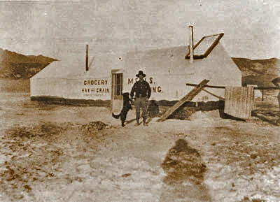 The Stovepipe road house is quite an up-to-date place. The equipment includes a grocery, eating house, bar, lodging house, corral, stock of hay, grain and provisions,--a little community in itself where travellers may find rest and food for themselves and their beasts. Just now, decided improvements are in progress. A fly is being added to the main tent, walls are being dug, bath room installed, and a pump is being placed to take care of the water. Hammocks will be added for the comfort of guests. Good accommodations have been provided for ladies. Free water is furnished, and every day the place is alive with freighting outfits, etc. going between Rhyolite and Skidoo. Stovepipe is 25 miles from Rhyolite; the half-way station. Meals are 75 cents; beds, 75 cents. The telephone. connects Stovepipe with the outside world, via Rhyolite."