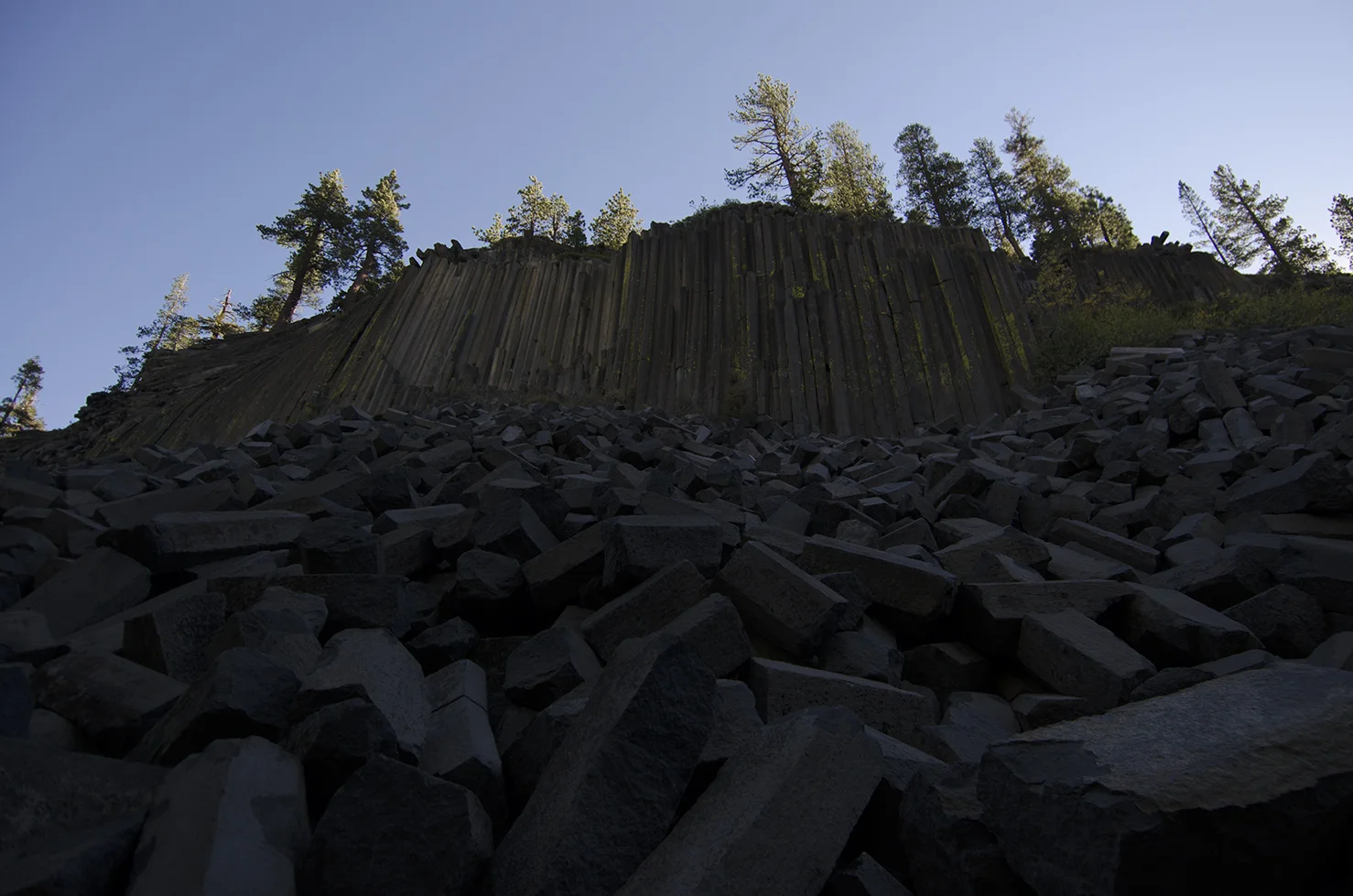 I arrived pretty early in the morning, and when I hiked to the postpile, I found that early morning is not the best time for photographs. The face of the postpile was completely in shadow and would be until sometime after noon.